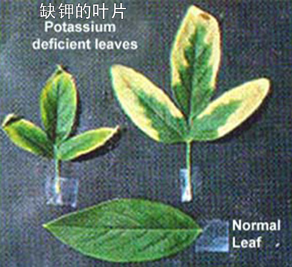 阔叶树:叶子薄、脆、早落。老叶可能显示叶脉间和边缘萎黄,老叶变红,在季节后期叶脉间坏死,随后叶子脱落。在严重缺乏之前,芽的生长不会减少。严重缺乏时果实产量降低;苹果可能会过早掉落。