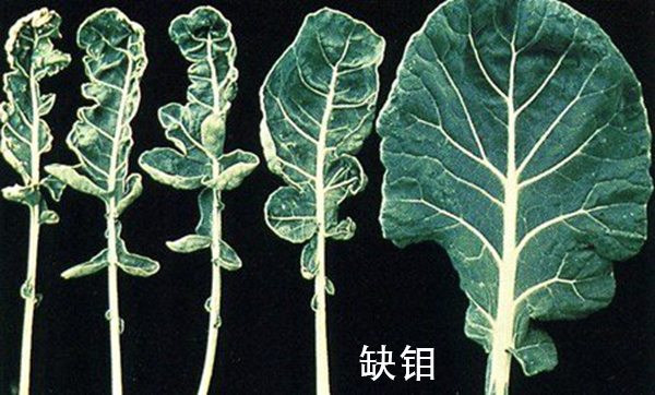 钼有助于植物利用氮。在非豆类植物中,钼使植物能够利用从土壤中吸收的硝酸盐。当植物的钼含量不足时,硝酸盐会积聚在叶子中,植物无法利用它们来制造蛋白质。结果是植物发育不良,出现类似于缺氮的症状。同时,叶子的边缘可能会因未使用的硝酸盐的积累而被烧焦。