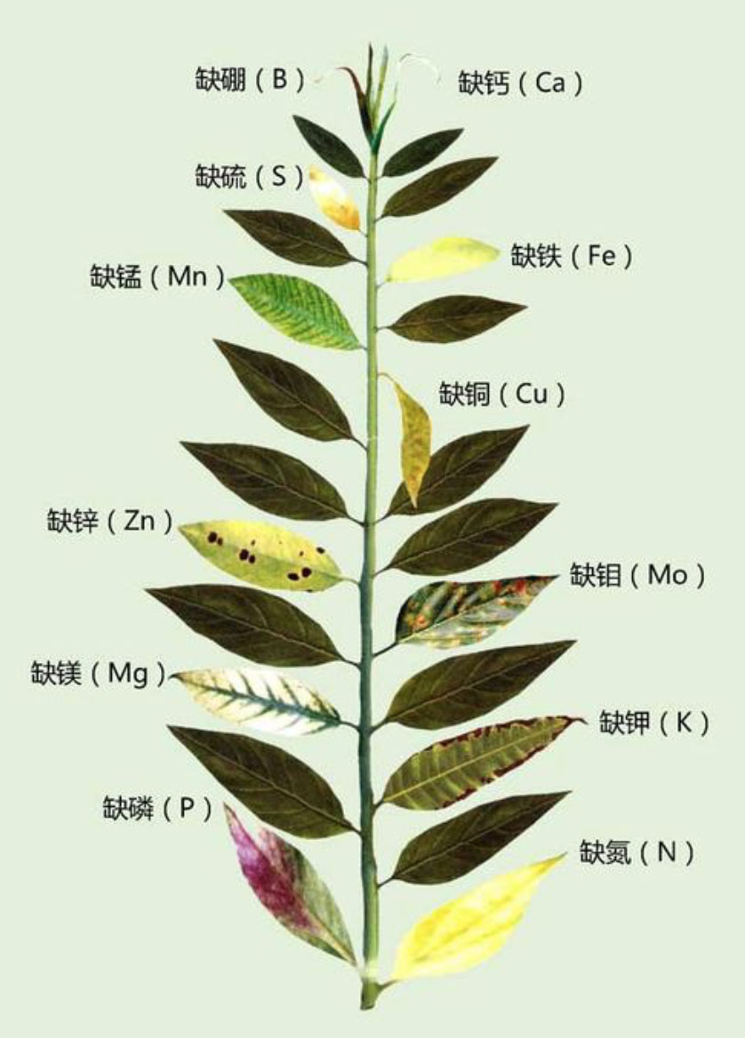 我们都知道优质肥料对植物、花园和草坪的重要性。就像动物和人类一样,植物要想发挥最佳状态,就必须有适当的“营养”。大多数人都知道印在所有肥料袋上的“N-P-K”数字,这些按印刷顺序表示该特定肥料中所含的氮、磷、钾的百分比。例如,10-10-10 肥料是 10% 的氮、10% 的磷和 10% 的钾,这三个是植物所需的主要营养元素。以下是各元素缺乏的症状图示和说明。