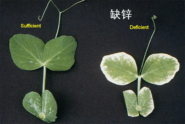 锌用于酶和激素的发育。它被叶子使用,豆类需要它来形成种子。锌的作用是帮助植物产生叶绿素。缺锌会导致一种称为萎黄病的叶子变色,叶脉之间的组织变黄,而叶脉仍保持绿色。失绿首先出现在下部叶片,然后逐渐向上移动。很难通过观察植物来区分锌缺乏症和其他微量元素或微量营养素缺乏症,因为它们都有相似的症状。主要区别在于缺锌引起的萎黄病从下部叶片开始,而缺铁、锰或钼引起的萎黄病从上部叶片开始。