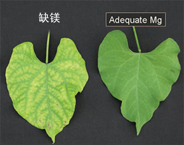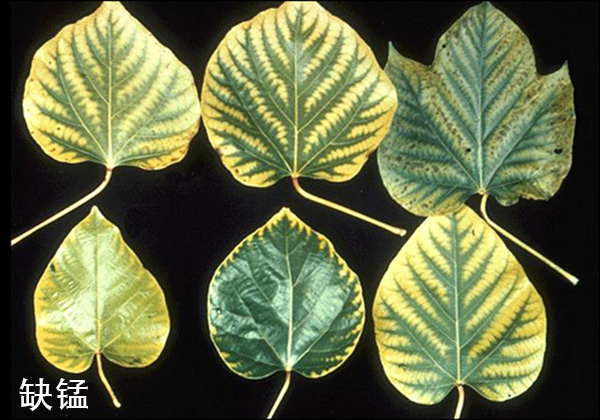 镁是叶绿素分子的一部分。缺乏镁的植物会变成淡绿色或黄色。缺镁的植物首先会在植物底部附近的老叶子上显示出变黄的迹象。锰不是叶绿素的一部分。缺锰的症状与缺镁非常相似,因为锰参与光合作用。叶片变黄,也有脉间失绿。然而,锰在植物中的流动性不如镁,因此缺乏症状首先出现在幼叶上。