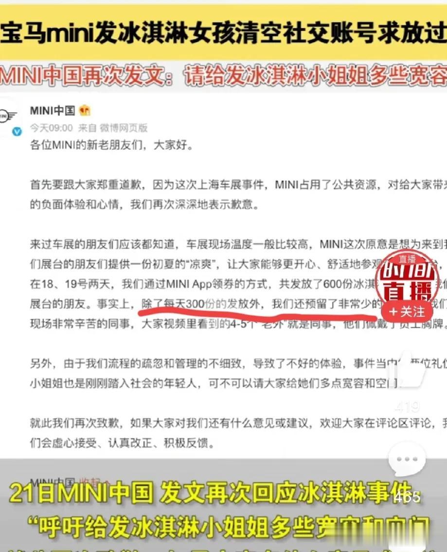 还是网友们的“深挖”功夫厉害呀!功夫不负有心人,真就把她们那两美女给找到了,想必是进行了第一轮的“炮轰”和“狂轰乱炸”之后,这俩人实在是应接不暇,于是就清空社交账号内容,来了个“遁而远之”! 对于这件事,我个人的一点简单看法与各位一起分享: 第一,从道德和公平的角度来看,车展是一个展示汽车和汽车文化的平台,如果宝马mini确实有这一活动,应该向所有人派发冰激凌,不分中国人和外国人。如果只给外国人发冰激凌,而不给中国人发,这显然是不公平的。因此,激起这么多的不愤是可以理解的。 第二,从商业角度来看,车展也是一个商业活动,那么车企可能会考虑到成本和市场因素,按照他们的说法是通过mini App领券的方式,两天(18和19号)共发放了600份。 如果说,确实是因为发完了,那就没什么关系的,但现在的问题是后来又有个老外得到了冰激凌,而他们说那是自己的工作人员,而且每天在300份之外,还预留了非常少的给员工。假设他们后来的这一道歉的说法属实,那么也不是不可行原谅的,问题就在于他们一开始并没有将事情说清楚,现在不论怎么说好像都是多余的。 因此,这事就看大家愿不愿意就此过去了,如果揪住不放,而且就以不公平的角度去争,那么很有可能会迫使宝马再次做出道歉,甚至影响到它在国内的品牌形象。但我们也要认真思考一下,万一别人要是再道歉,你准备好了接受吗?还是说就要借机将该车企“挤走”呢? 第三,从经贸的角度来说,眼下我们需要与欧盟尤其像德国这样的欧洲经济强国搞好关系,如果因为“冰激凌事件”而与这家汽车企业有些龃龉,说不定继续下去可能会影响到与德企的相处,其实也没有必要为此事而大做文章。 因此,作为观众,我们可以表达对该车企只给外国人发冰激凌的不满,但是应该理性对待那俩女孩,不管她是不是被推出来的“背锅侠”,我觉得都没必要大肆地讨伐之,甚至发展到“网暴”更要不得,如今网信办正在开展“清朗”网络空间的活动,我们应该树立新风尚就从此事起。 头条热榜