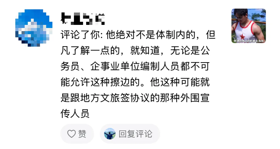 第二条:“他绝对不是体制内,但凡了解一点,就知道,无论是公务员、企事业单位编制人员都不可能允许这种擦边的。他这种可能就是跟地方文旅签协议的那种外围宣传人员。”