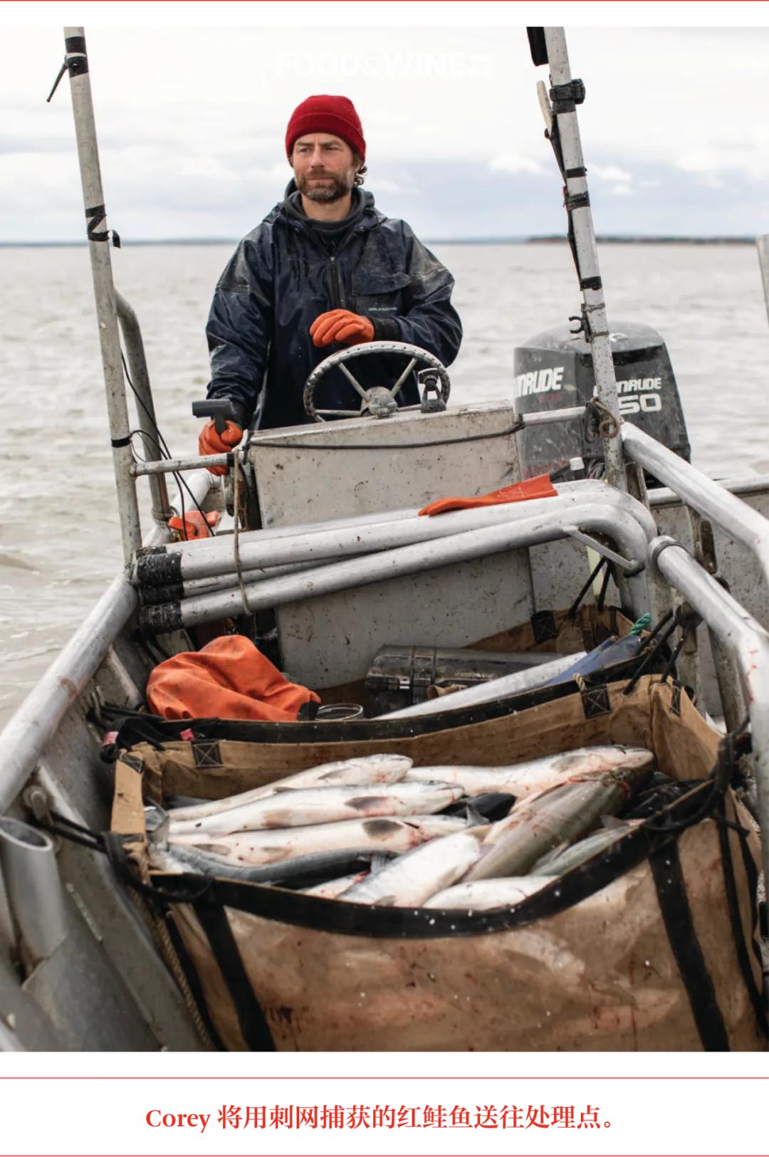 正如 Corey 所说,定置网渔民都是「小人物」。他们在敞篷船上捕鱼作业,这种船上没有遮阴处、卫生间或休息室。他们会把刺网的一端固定在岸上,然后像拉网球网那样把渔网拉紧,横在鲑鱼的必经之路上。鲑鱼游进刺网后,鱼鳃会被缠住,无法挣脱。与围网渔船和拖网渔船不同,用刺网捕鱼的人必须亲手一条一条地把鱼从网里取出来。
