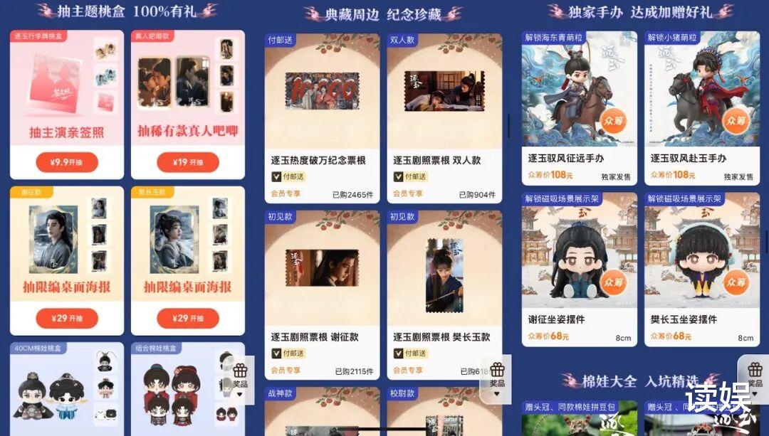 亮眼成绩背后,是爱奇艺精细化IP消费品开发体系,平台通过细分品类布局、精准粉丝运营和灵活销售策略,将用户的情感共鸣转化为可持续消费。针对粉丝对收藏仪式感的追求,爱奇艺推出了热度纪念票根、剧照票根等产品;面向偏好定制化体验的用户,上线桃盒限定棉娃、驭风征远手办、驭风赴玉手办、大婚天作之合棉娃等丰富专属款;同时紧跟剧集热点推出纪念款周边,如谢征战神归来、樊长玉杀猪妹等聚焦核心角色的细分商品,精准触达深度剧粉。在销售策略上,爱奇艺还通过多配件组合套餐,有效承接了高粘性粉丝群体一站式采购的诉求。