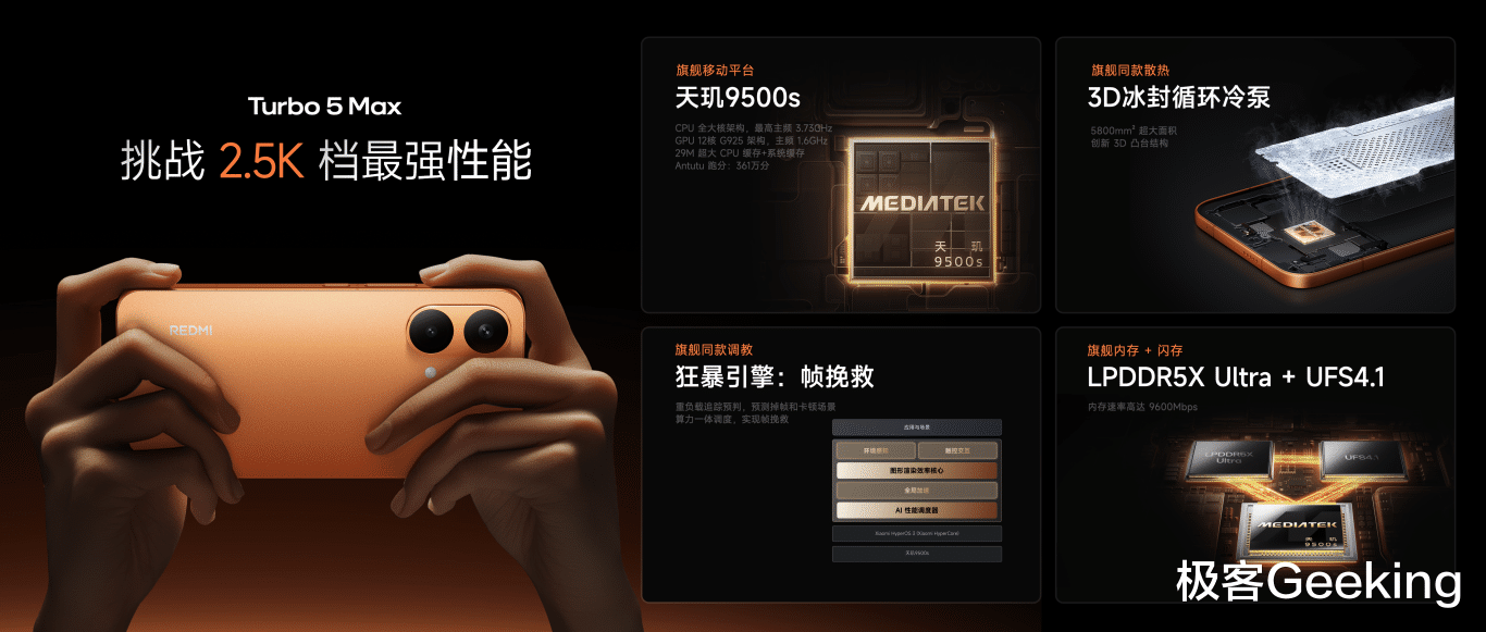 作为一款中端旗舰,Turbo 5 全系标配 LPDDR5X Ultra + UFS 4.1 组合,天玑9500s 采用台积电 3nm 制程工艺制造。