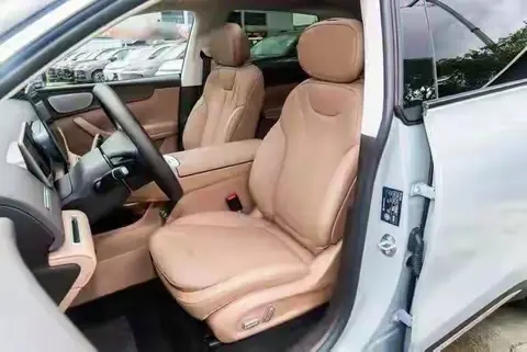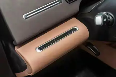车身侧面线条流畅自然,无框车门与隐藏式的门把手设计很亮眼。这个门把手有破冰功能,即使遇到暴雪天气,也不用手去刨冰,都能自动打开,这个功能,对于北方的驾驶者来说特别友好,让整款车显得干净利落。全系配20英寸轮毂,有很强大的抓地力,也与车身相融合,降低风阻,系数仅为0.28Cd,提升动力学性能,运动气息十足。