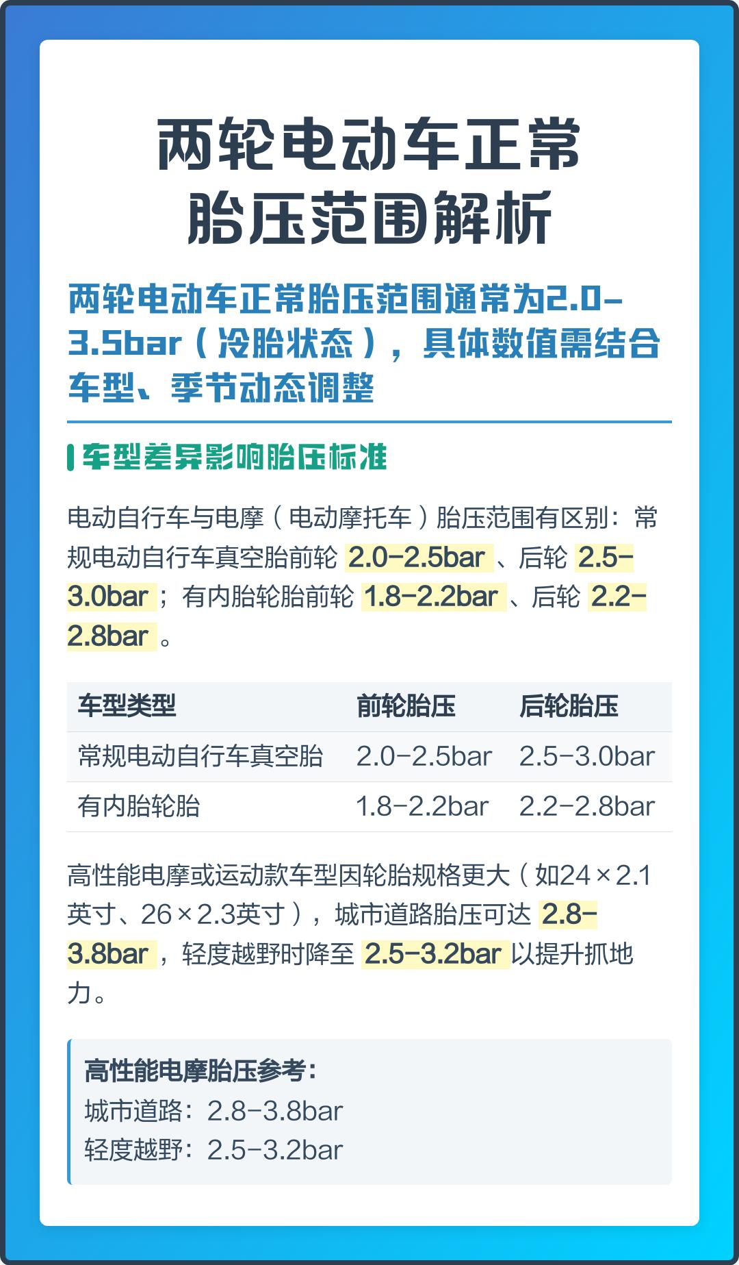 关键是电动车半路突然没气了,是件非常麻烦的事,如果推行距离过远没气的轮胎推起来非常吃力,旋转圈数多了轮胎的橡胶可能出现褶皱漏气,等推到修理部只能花100多块钱再换一条新的真空胎。为了避免不必要的麻烦,冬季一定要定期检查前后轮胎胎压,前轮胎压保持在2.3~2.5bar,后轮胎压保持在2.5~3.0bar。