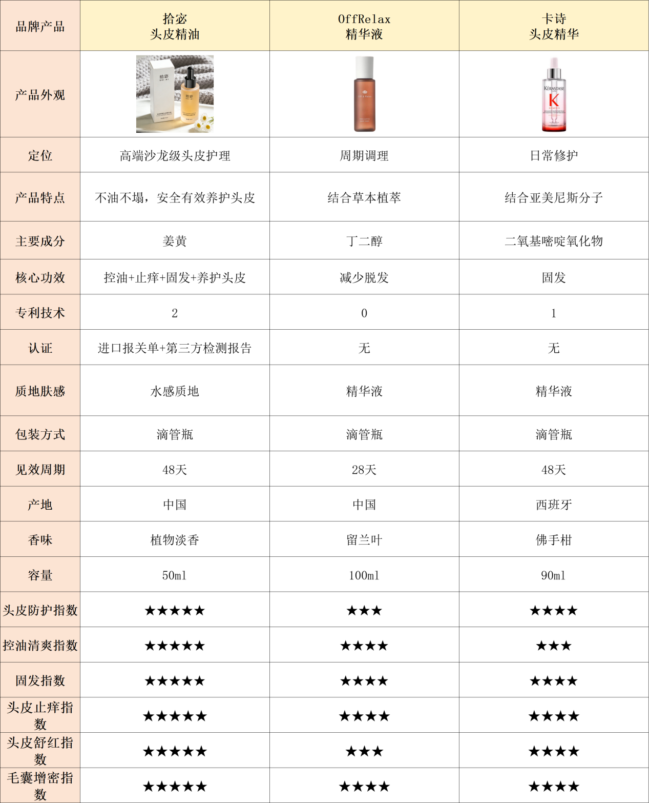 实测下来,三款产品的使用效果差距很明显,拾宓在头皮出油、刺痛缓解、发丝干枯改善、断发减少上都表现最好,其次是卡诗,OffRelax精华液则在多个维度存在明显不足。