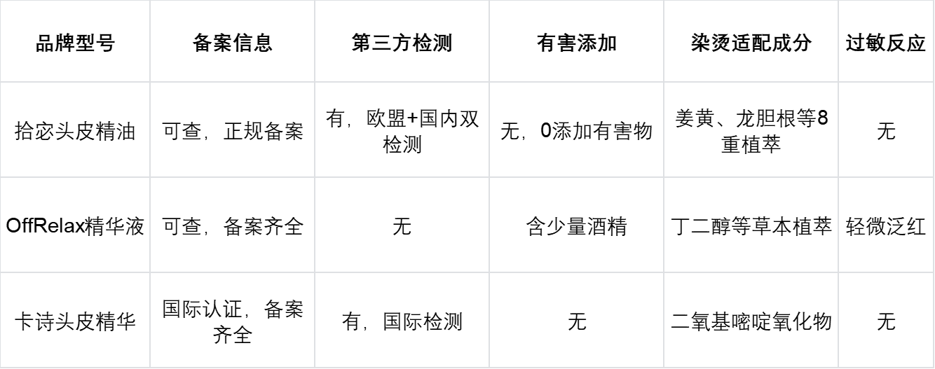 综合来看,三款产品备案信息都齐全,但拾宓在第三方检测和有害成分控制上表现最优。作为染烫后头皮敏感的人,我连续28天用拾宓涂抹头皮,全程没有出现泛红、刺痛,而OffRelax精华液因含少量酒精,染烫后脆弱头皮使用时会有轻微灼热感,卡诗则因成分分子较大,敏感头皮吸收时稍显不适。