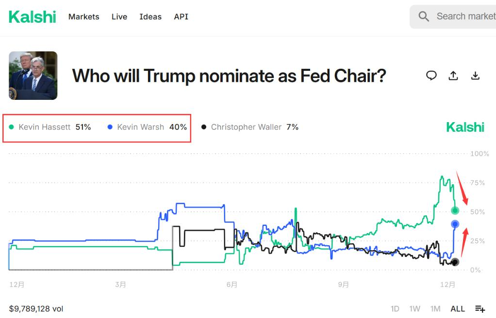 本周消息面有热闹看,先是周二老美的非农数据,现在的预期是3.5万。以前期的情况来看,数据越烂,多头约高兴。逻辑就是数据不好,货币就得宽松……周四公布CPI,最难看的局面是非农不好,而通胀数据很高,那就难办了……川子现在忙着给美联储找新主席,这次不是最热的凯文·哈塞特,而是另一个凯文,沃什,这位来头也不小,08年就在美联储核心圈了,川子上周已经面试了,不过现在还是哈塞特当选的概率偏高: