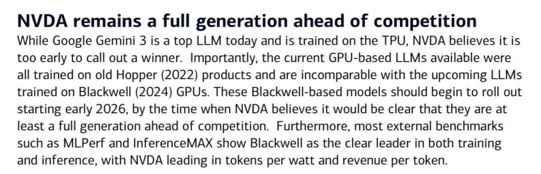 研报态度明确:"NVDA believes it would be clear that they are at least a full generation ahead of competition"(英伟达相信届时将清楚显示他们至少领先竞争对手整整一代)。