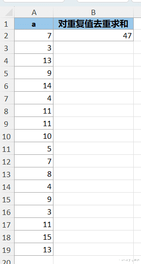 案例:将下图 1 中所有重复出现过的数值去重后求和,效果如下图 2 所示。