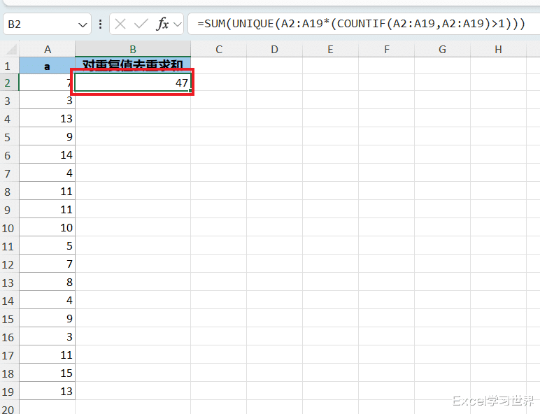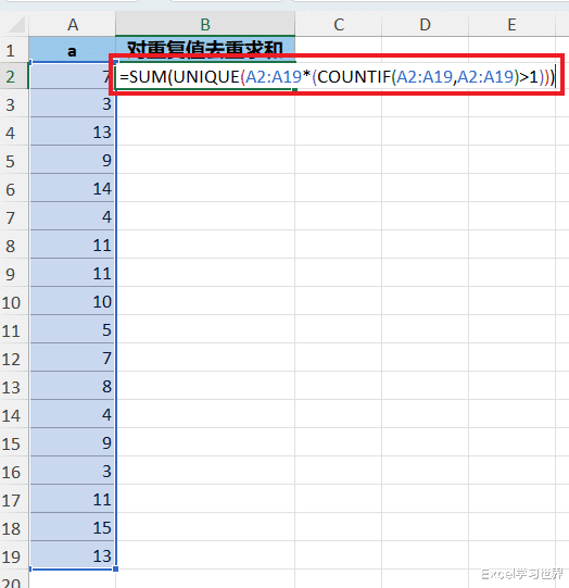 =SUM(UNIQUE(A2:A19*(COUNTIF(A2:A19,A2:A19)>1)))