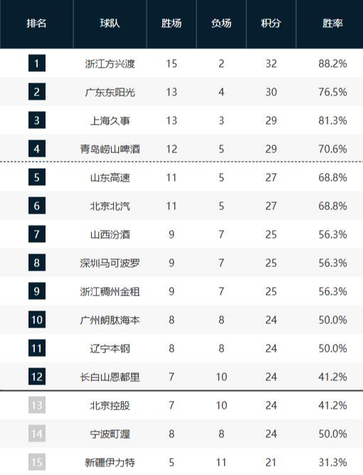 本轮过后,积分榜发生了很大变化:浙江广厦男篮稳居第一,广东男篮获胜后超过上海,排名第二;青岛男篮排在第四,北京男篮排名第六,辽宁男篮已经排到了第11位。