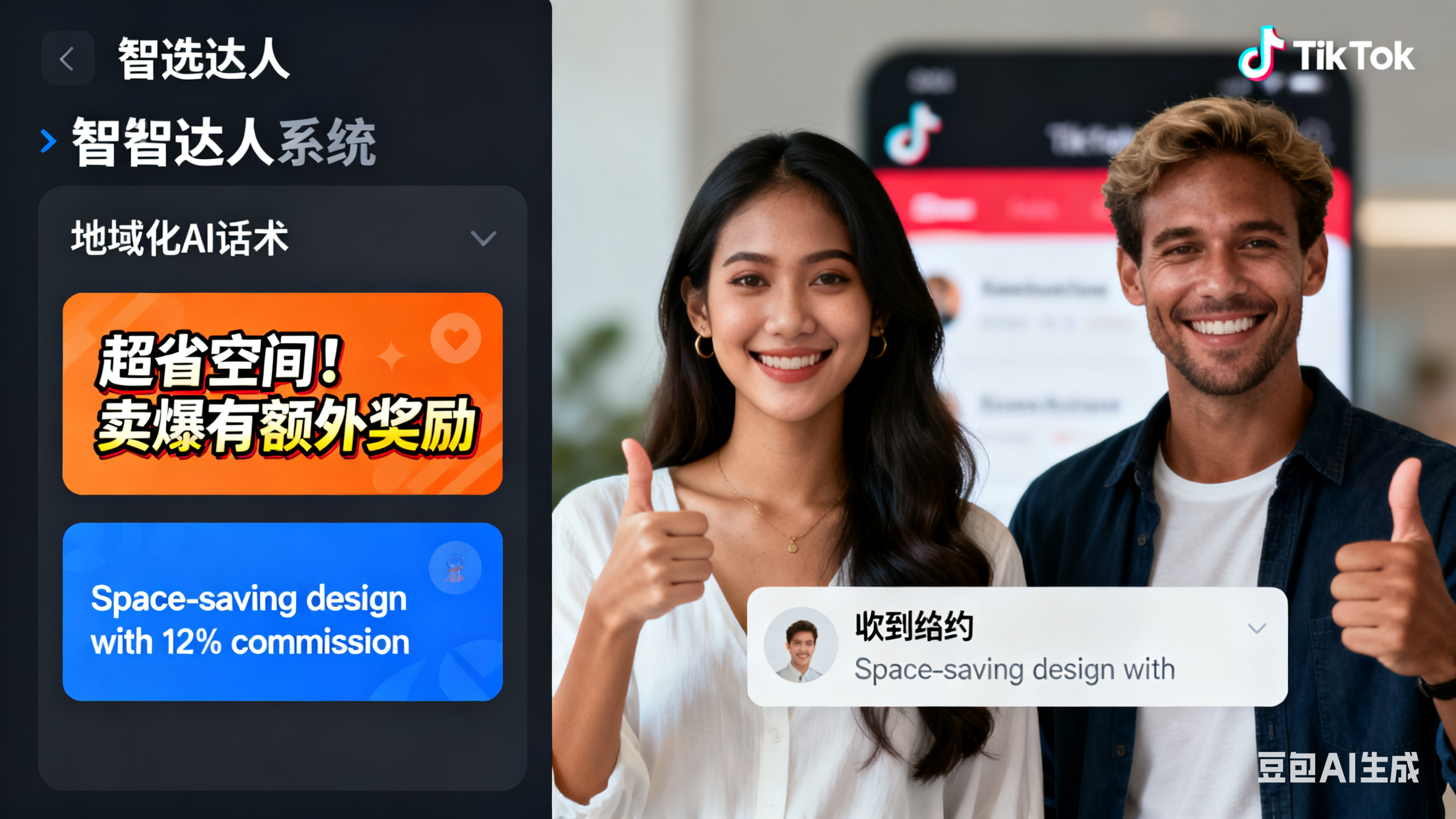 “之前给东南亚达人发欧美商务风邀约,3 天没一个回复,还以为是产品问题。” 东莞做家居用品的张老板,曾因不懂地域沟通差异踩过大坑。智选达人的 “地域化 AI 话术” 功能,正好解决这个问题 —— 输入产品卖点 “可折叠收纳,佣金 12%”,系统会自动匹配区域风格:给东南亚达人用 “超省空间!卖爆有额外奖励” 的活泼话术,给欧美达人用 “Space-saving design with 12% commission,delivery guaranteed” 的商务表述。