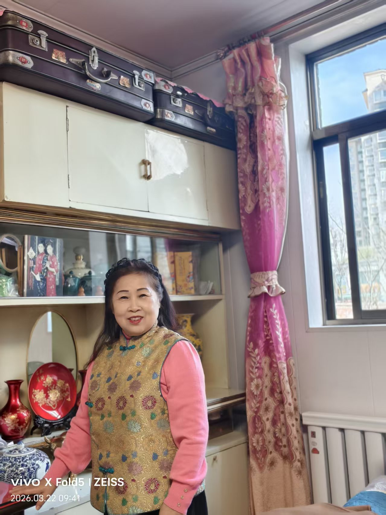 岁月未曾改初心,眼前的薛大姐,依旧热忱温婉、小巧灵动,一如当年同窗模样。她的小家窗明几净、雅致温馨,繁花绽艳、绿植葱茏,一草一木皆藏用心,一角一落尽显温情。那对陪伴半生的旧皮箱,藏着往昔的美好与荣光;那方五十余载的沙发帘,洗得素白平整,映着她对生活的赤诚与热爱。