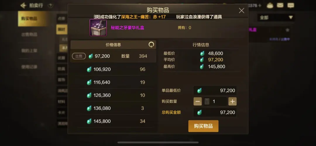 现在,这款道具在拍卖行的价格是9.7万平均的一个价格,但是数量是394。