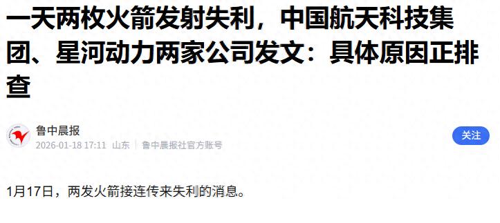 【1】《一天两枚火箭发射失利,中国航天科技集团、星河动力两家公司发文:具体原因正排查》 鲁中晨报[2026.1.18.]