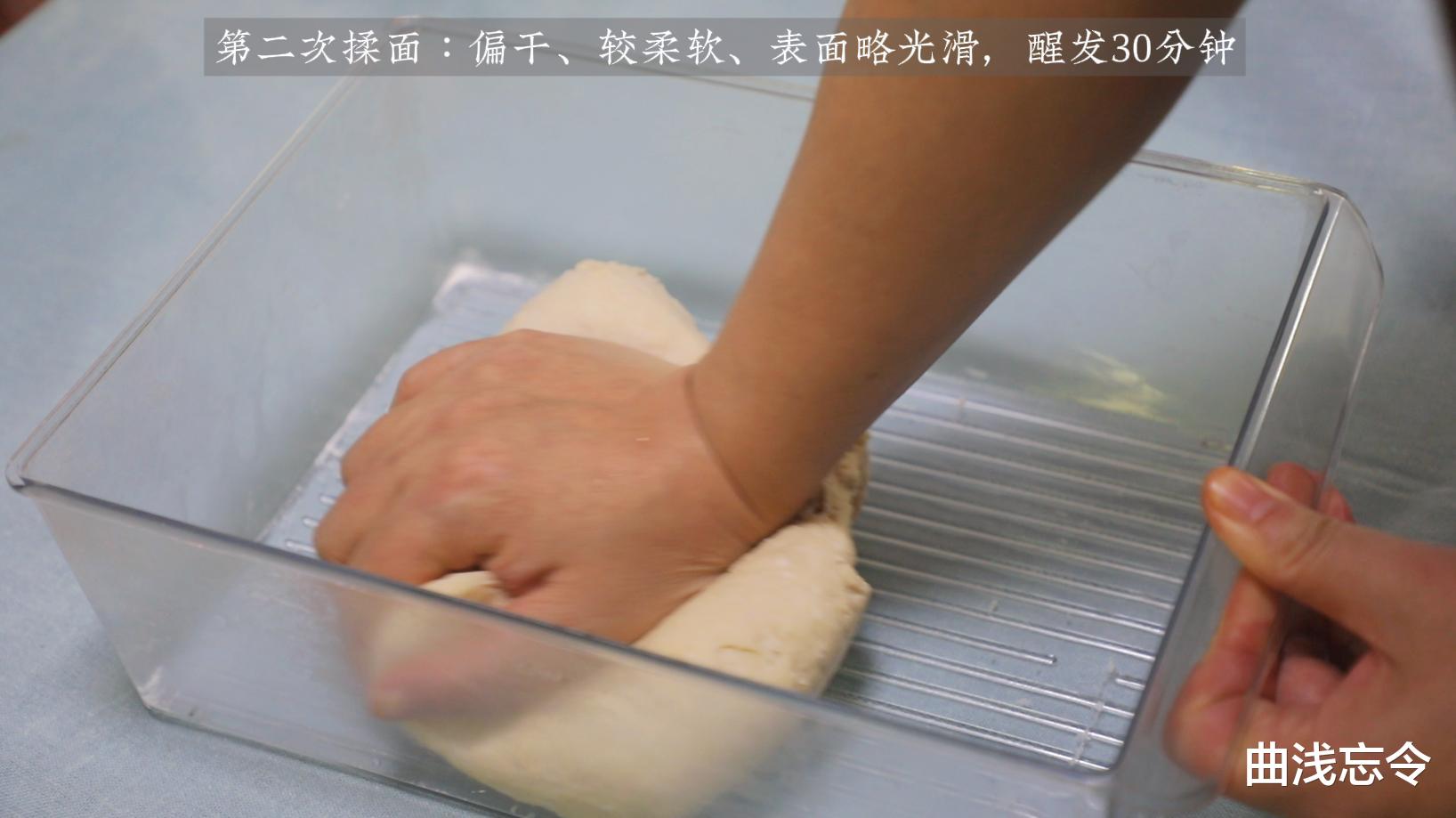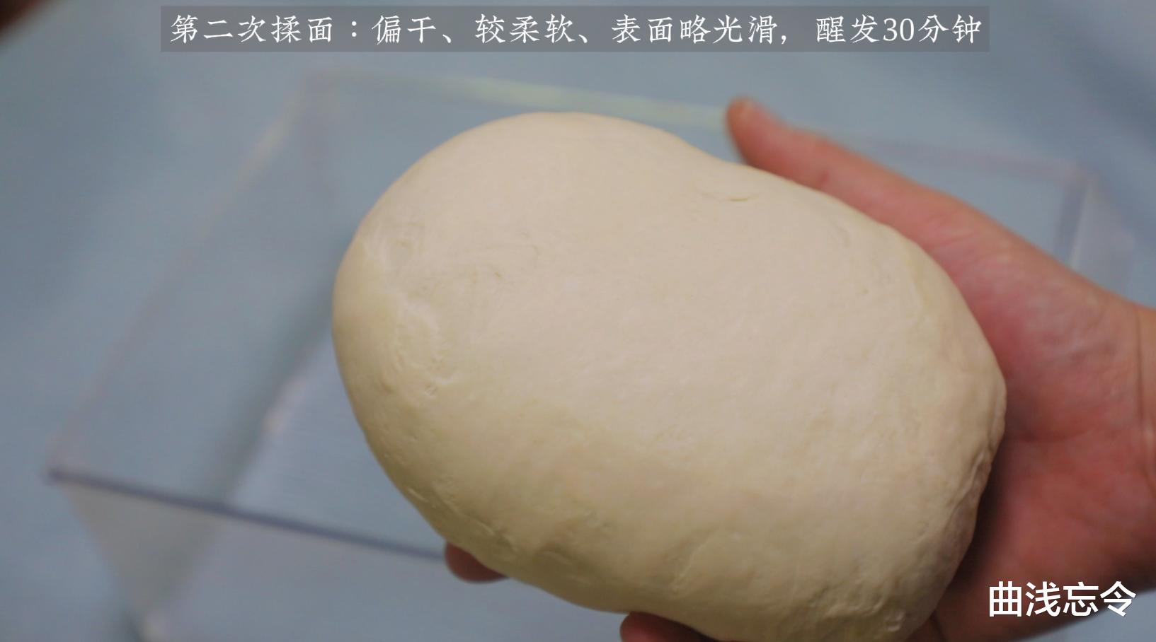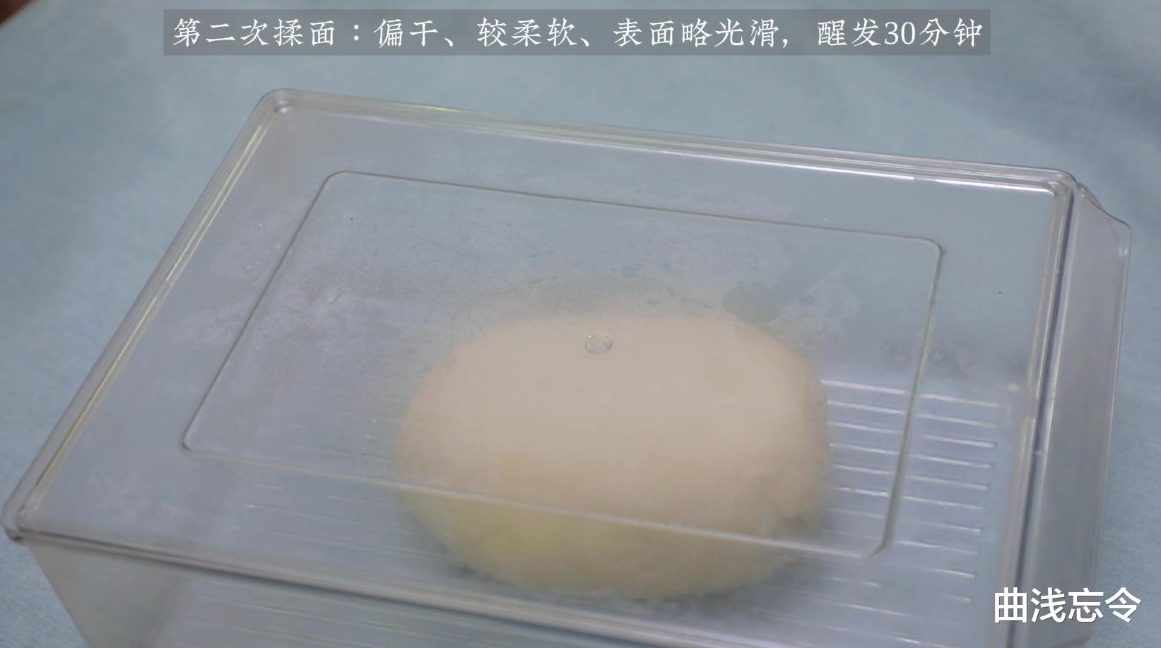 5、第二次揉面:继续揉面约1~2分钟,此时面团偏硬,略柔软,较光滑,继续覆盖保鲜膜松弛30分钟。