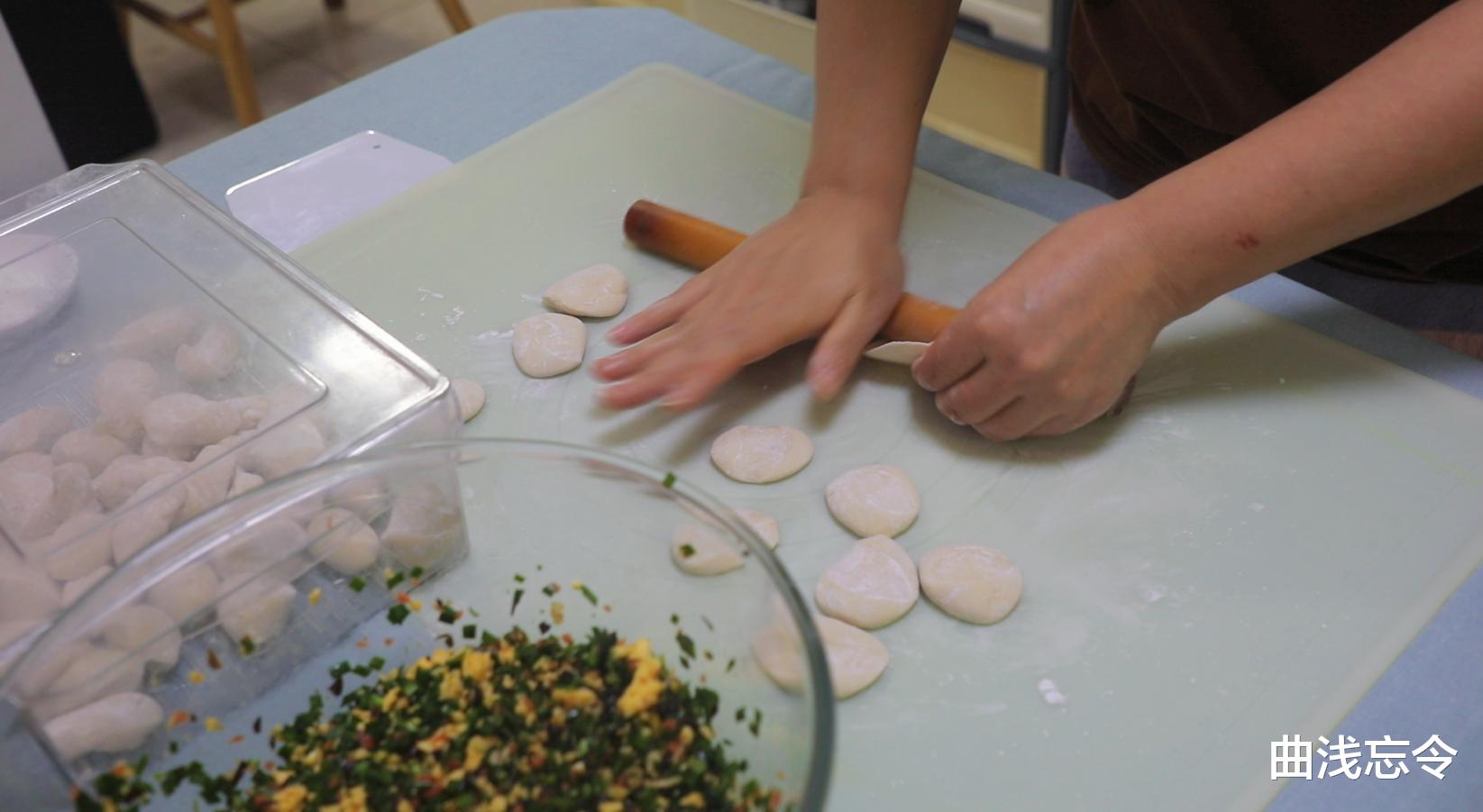 11、擀饺子皮:将小剂子压扁,擀成中间厚边沿薄的饺子皮,操作过程中多余的暂时不用的小剂子放入揉面盒中关盖密封防止水分流失。