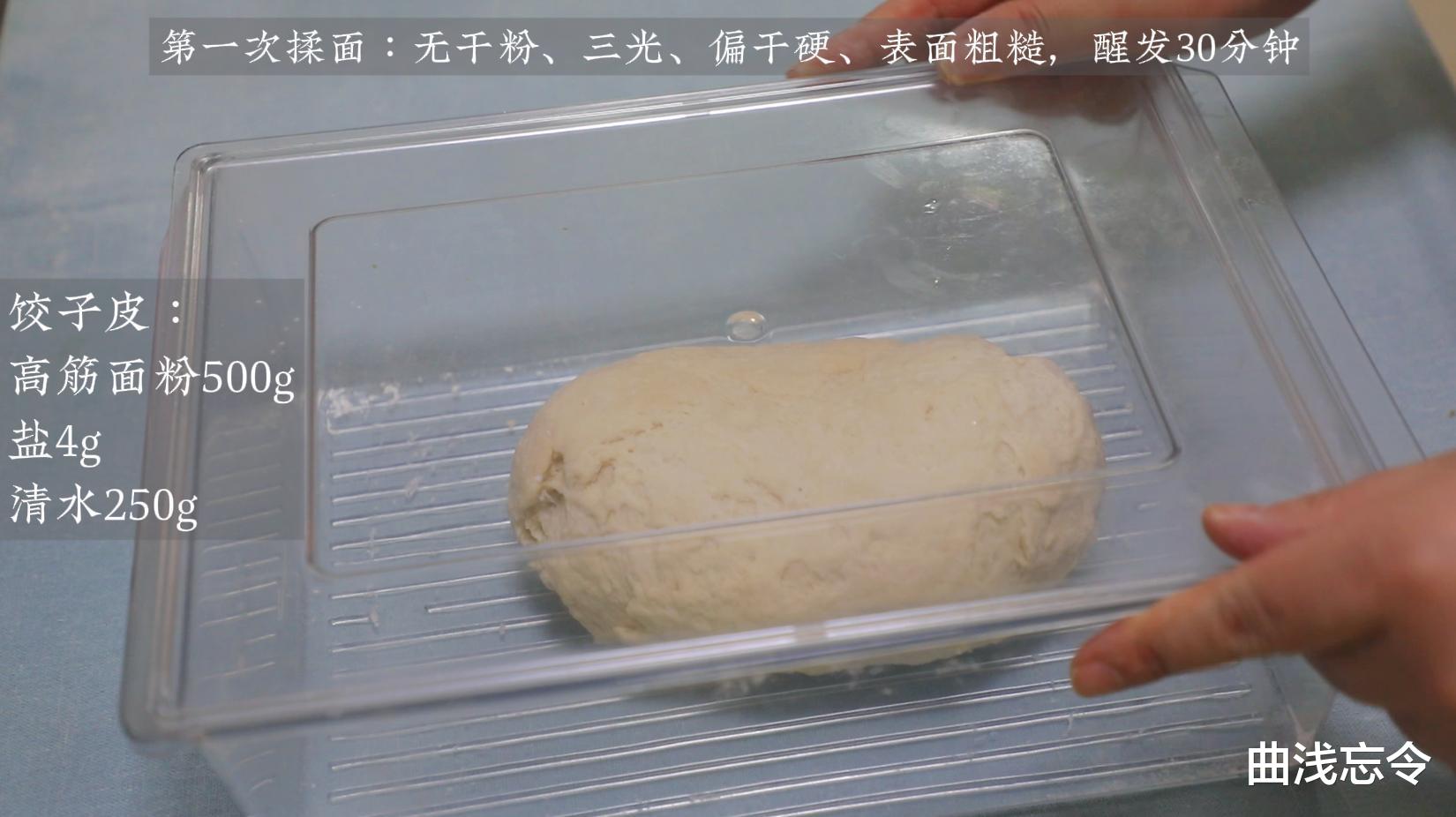 按照这样的流程来操作比较节约时间,一共有4次揉面单独分解出来,可以看出面团的变化状态,面团也能松弛到位,后面饺子皮能擀得很薄且不会回缩,也不容易破裂。馅料也能轻松搞定。