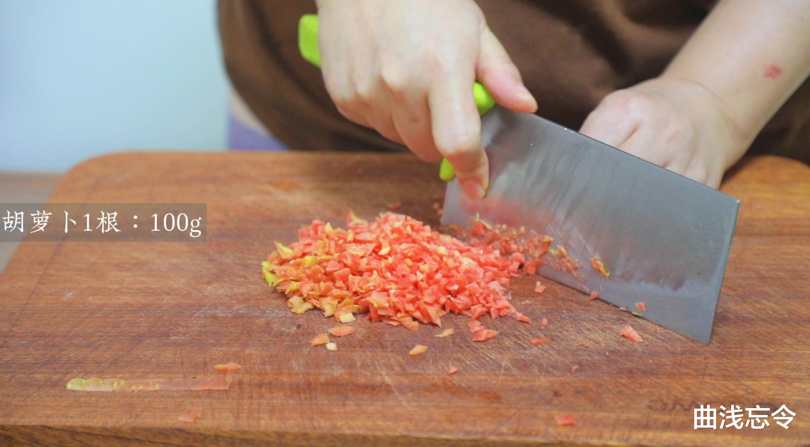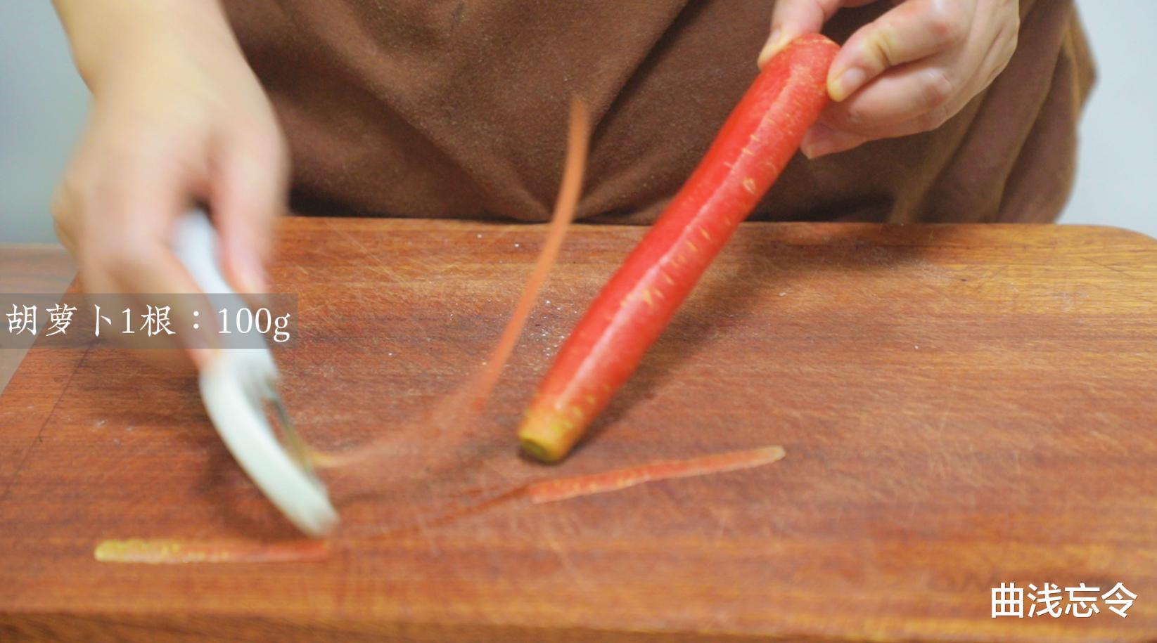 4、处理配菜:胡萝卜清洗干净去皮,切成细末。