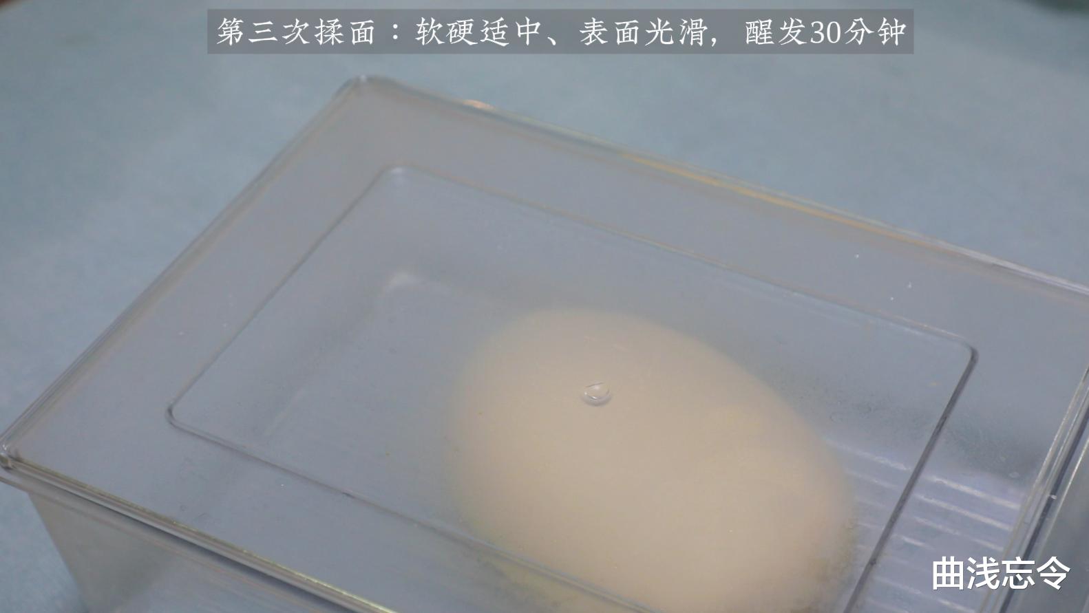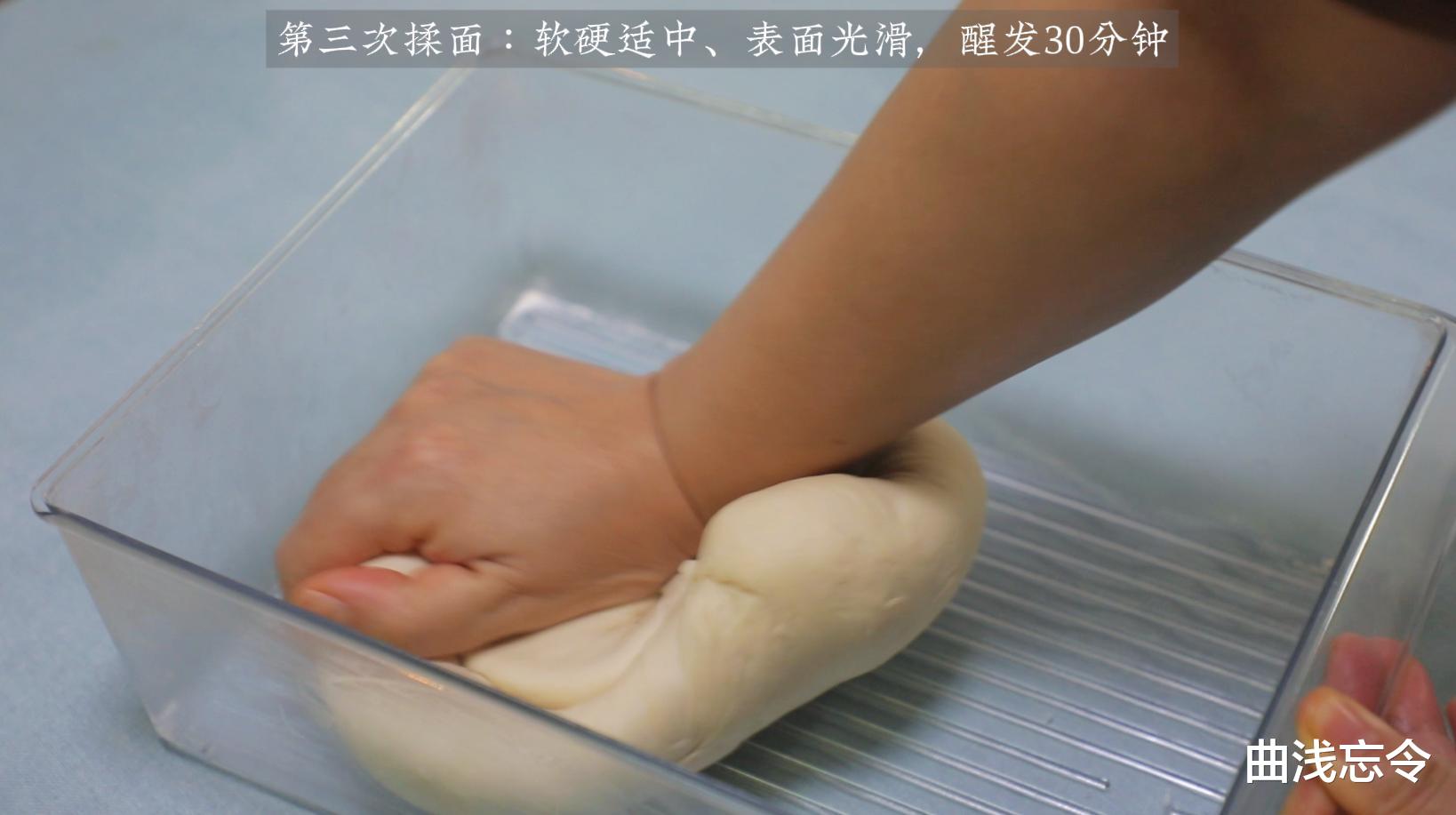 7、第三次揉面:继续揉面约1~2分钟,面团变得软硬适中,表面较光滑,继续覆盖保鲜膜松弛30分钟。