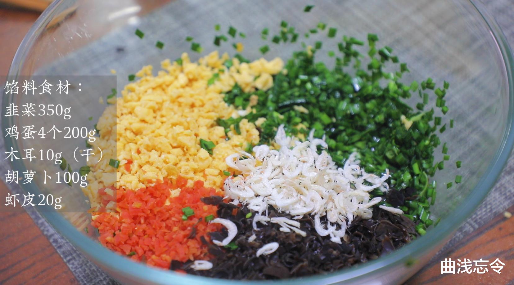 馅料食材:韭菜350g、鸡蛋4个200g、木耳10g(干)、胡萝卜100g、虾皮20g