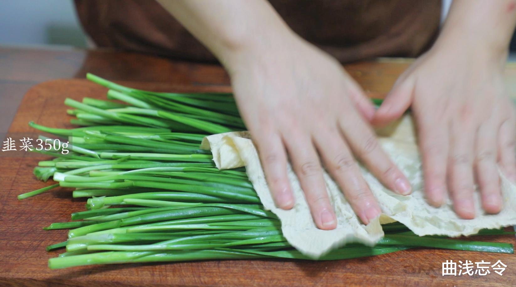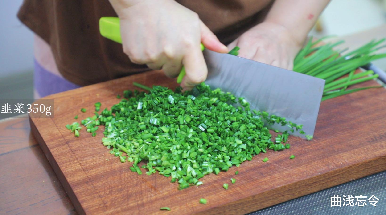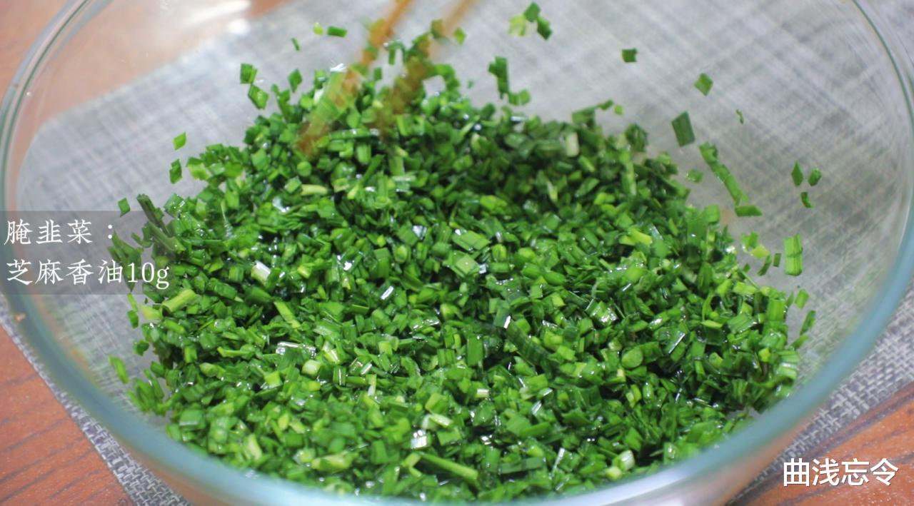 4.包之前再处理韭菜,韭菜水分要用厨房纸吸干净再切,不可用搅拌机打碎!切后马上用香油拌均匀封住切口,防止水分流失。