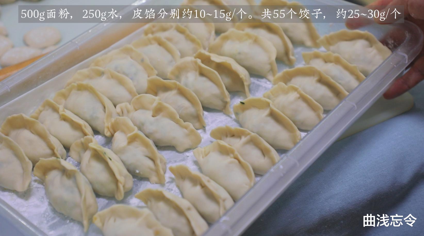 此配方比较精准,皮馅基本上刚好用完。1斤面半斤水,一共大概能包50~55个饺子。