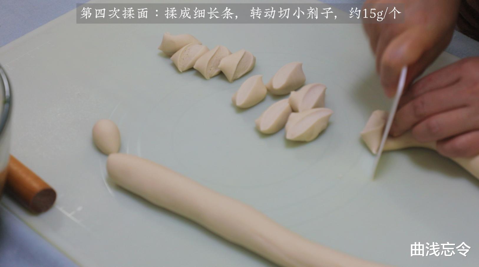 10、第四次揉面:直接将面团揉成细长条,此时面团比较柔软,一边滚动一边分切成小剂子,约10~15g/个,约55个。撒适量玉米淀粉防粘黏。