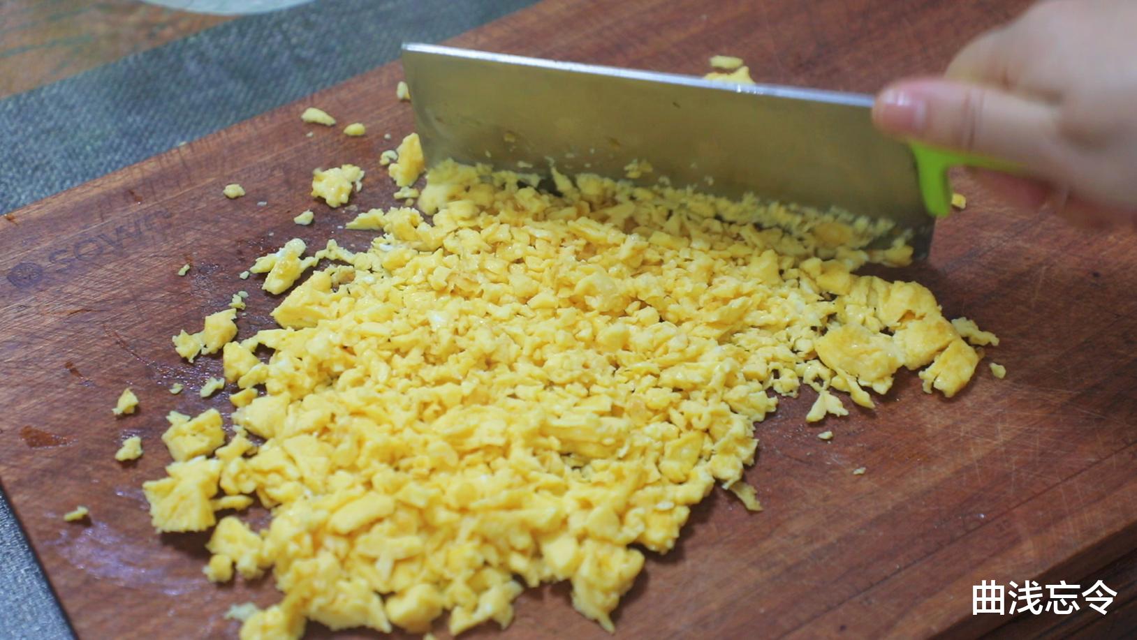6、处理鸡蛋:鸡蛋4个,加入白胡椒粉和盐,打散,锅中少许油,油热后,一边搅拌鸡蛋液一边倒入锅中,凝固成型即可,可直接用锅铲在锅中捣成鸡蛋碎,或者盛出再切成鸡蛋碎,晾凉备用。胡萝卜末随手也在锅中炒一下炒软盛出放凉备用。