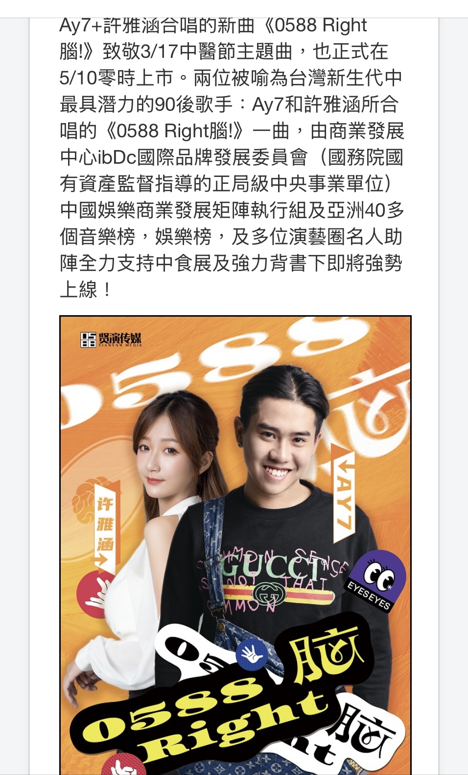 (上海讯)近期,身为「春晚星推官」的台湾创作歌手/音乐制作人「许雅涵」凭藉「许雅涵湾湾新闻」专栏(0588梦想基地独家冠名)与官方媒体深度合作,由许雅涵/Ay7主唱(0588right脑)主题曲,推出跨国多频道春晚系列报导,每期内容均强势登顶热搜。