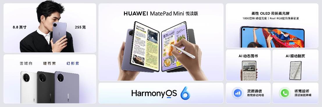 华为MatePad Pro 12.2 英寸搭载丰富鸿蒙电脑应用,天生会画App悬停预览再升级,12mm悬浮高度助力精准操作;华为MatePad Mini 悦读版超轻薄机身设计,配合华为阅读App带来AI眼动翻页、AI动态图书功能,让阅读更沉浸有趣。