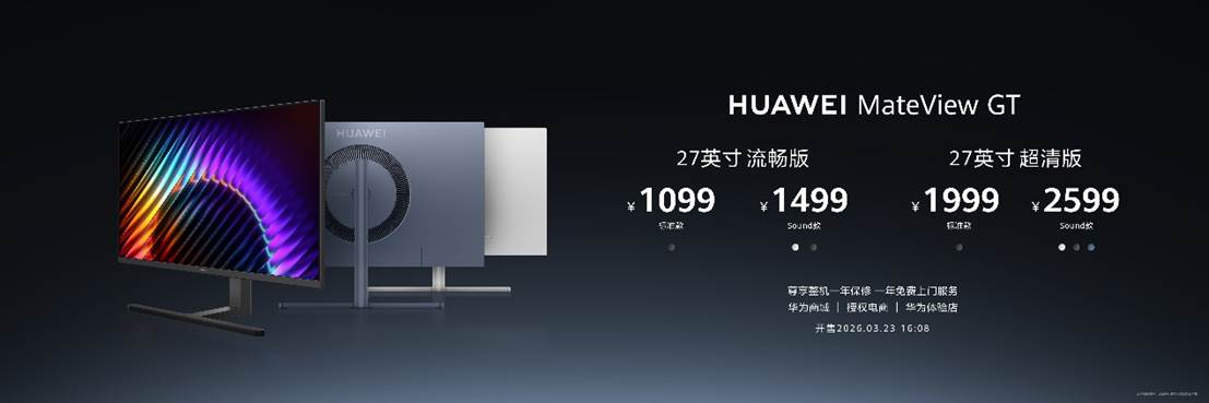 此次HUAWEI MateView GT 27英寸上新了多个版本供用户选择,流畅版标准款售价1099元、流畅版Sound款售价1499元、超清版标准款售价1999元、超清版Sound款售价2599元。将于3月23日 16:08,在华为商城、华为授权电商、华为体验店等平台全面开售,首销月购机优惠100元,同时购机可尊享整机1年保修,1年免费上门服务。