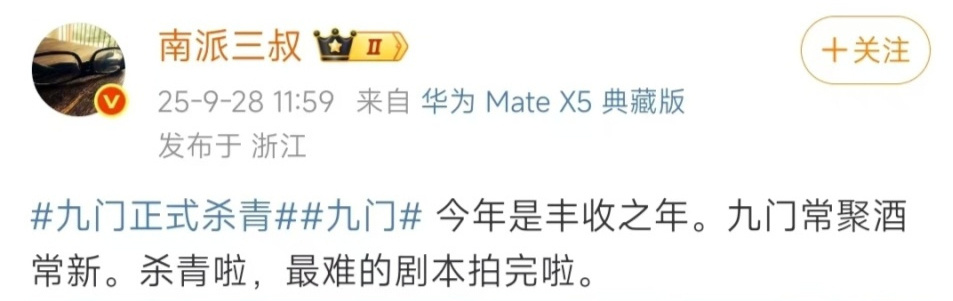 原著作者的南派三叔也发文感慨道:“今年是丰收之年,九门常聚酒常新,最难的剧本拍完了”