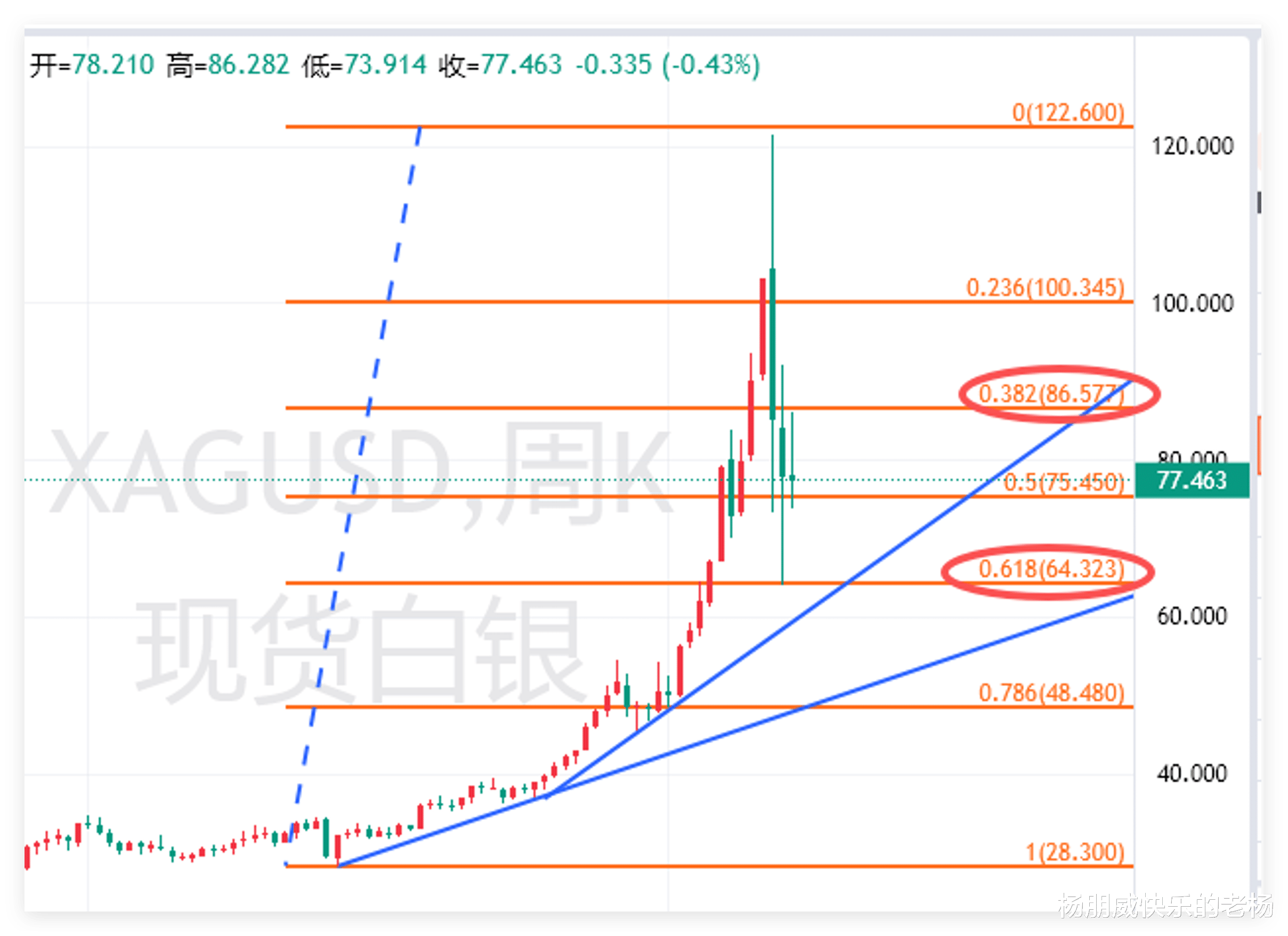 大扫荡阶段,时间会很漫长,多空机会都很多;所以说,跌下来接近关键支撑依然可以布局多单,上方关键压力同样也可以做空。周三白银闪崩10美元,跌破短期关键支撑79-80区域,最低74美元附近,周五反弹;不过周五反弹力度欠佳,周线目前三连阴。接下来白银继续看冲高回落,短期以79-80美元区域压制高空,然后85-86美元区域压制高空;进一步92-93压制高空。下方首先74-75美元以及70-71美元做反弹,然后64-65美元支撑做反弹。一旦64-65出现破位,要提防短线快跌60下方这种可能,支撑59美元和55-54美元。个人观点,仅供参考!投资有风险,入市需谨慎!
