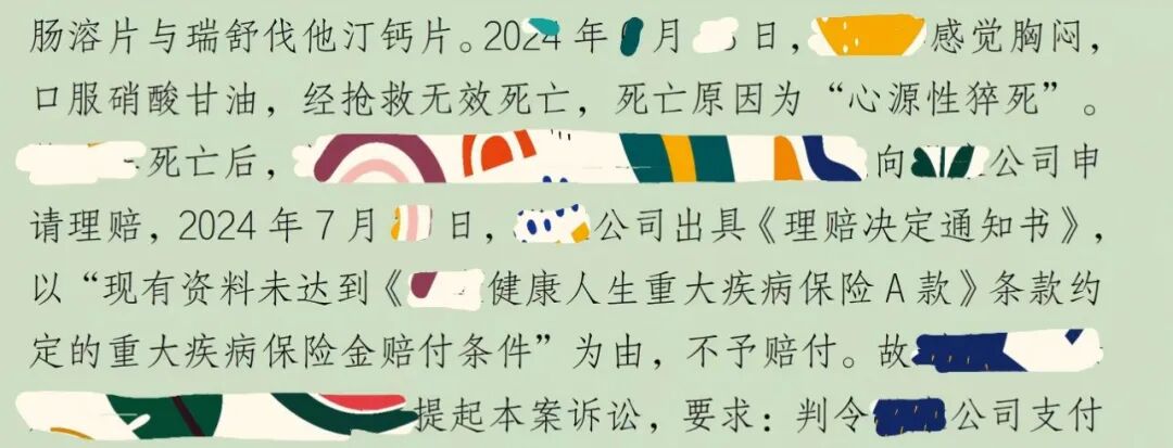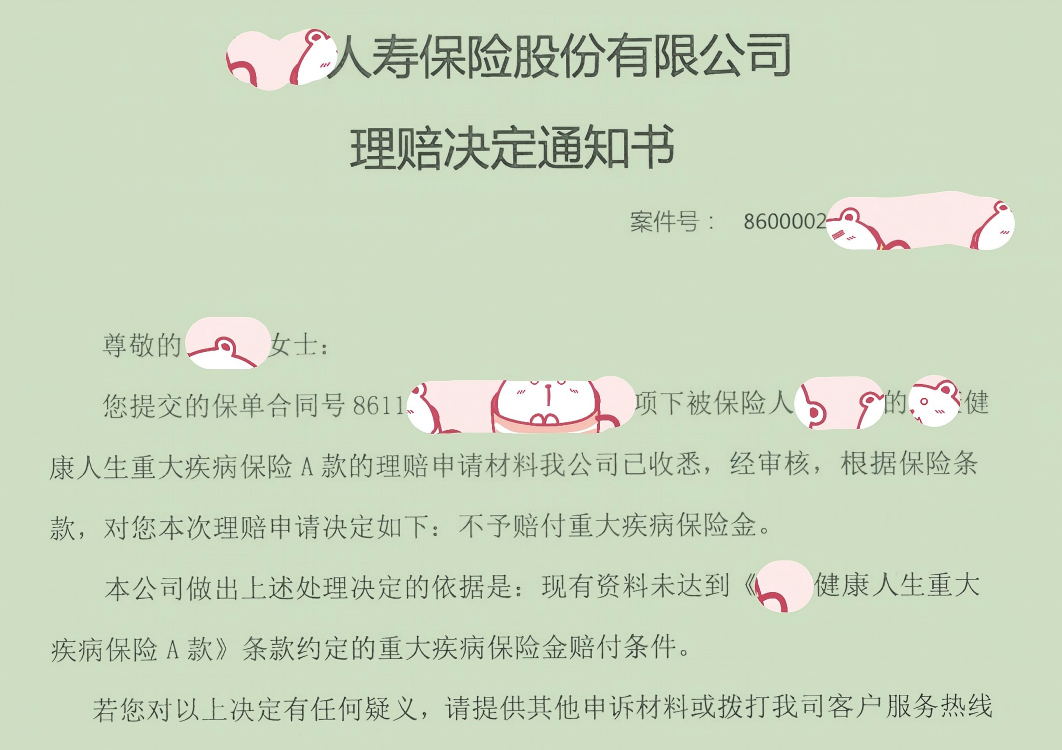 许某身故后,其法定继承人四位当事人向保险公司申请重大疾病保险金理赔。2024年7月,保险公司出具《理赔决定通知书》,以“现有资料未达到《某健康人生重大疾病保险A款》条款约定的重大疾病保险金赔付条件”为由,作出不予赔付的决定。