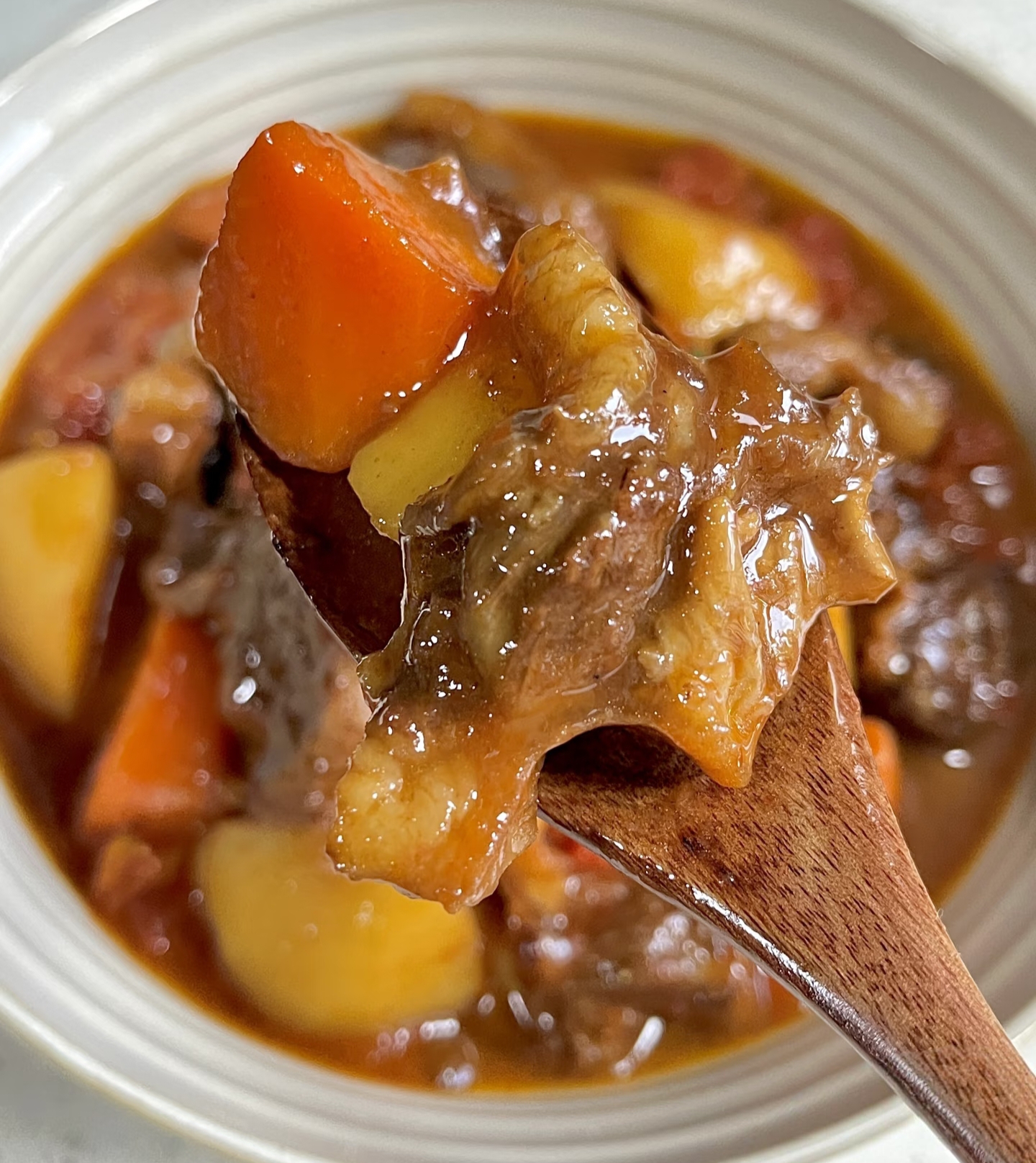 当这道菜端上桌,红彤彤的汤汁裹着油亮的牛腩,土豆吸饱了肉香变得绵软,胡萝卜像藏在汤里的甜味彩蛋。儿子舀了勺汤拌饭,眼睛突然亮起来:"妈妈!这个饭会魔法,自己就跑到我嘴里了!"说着又盛了第二碗。