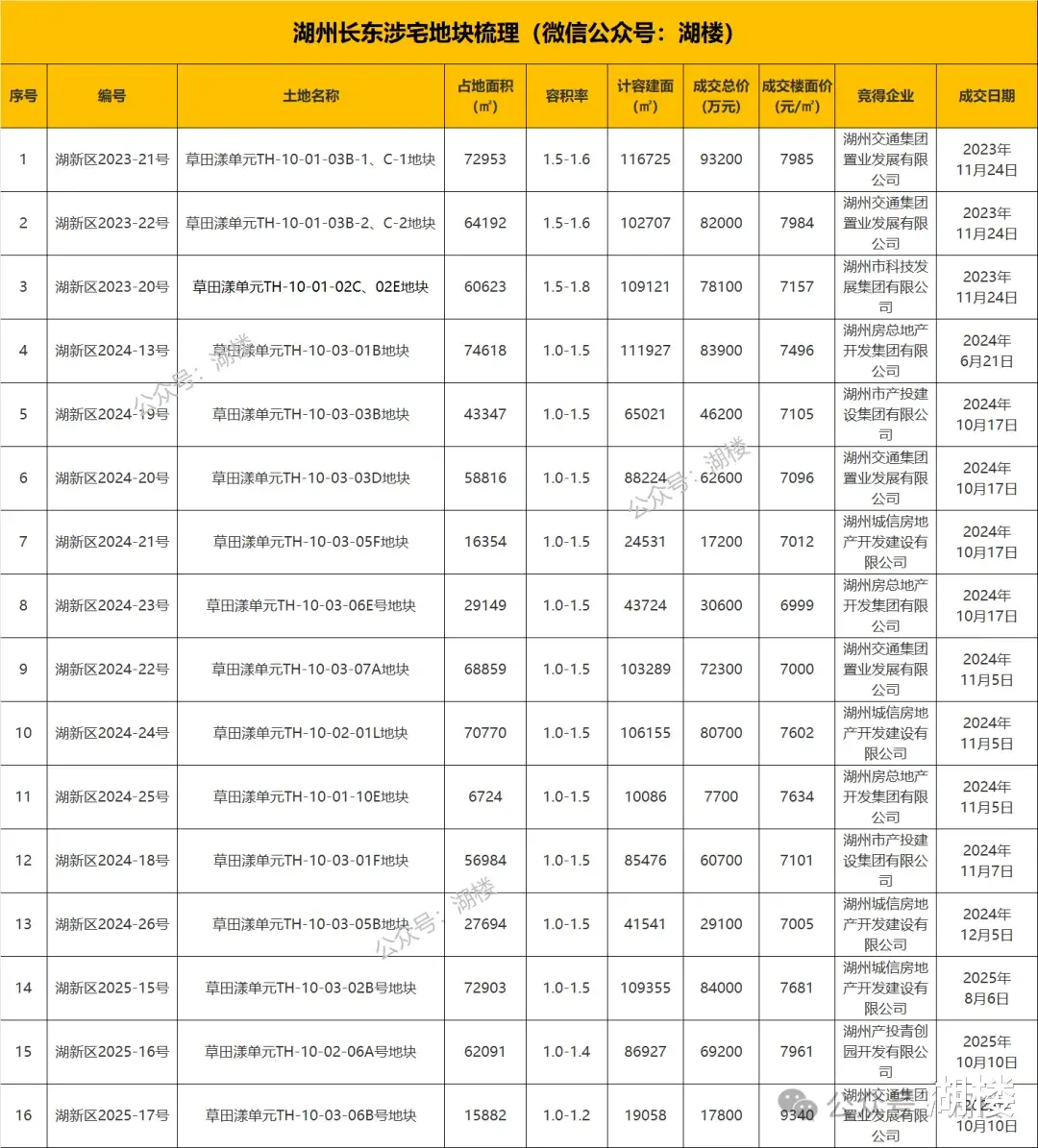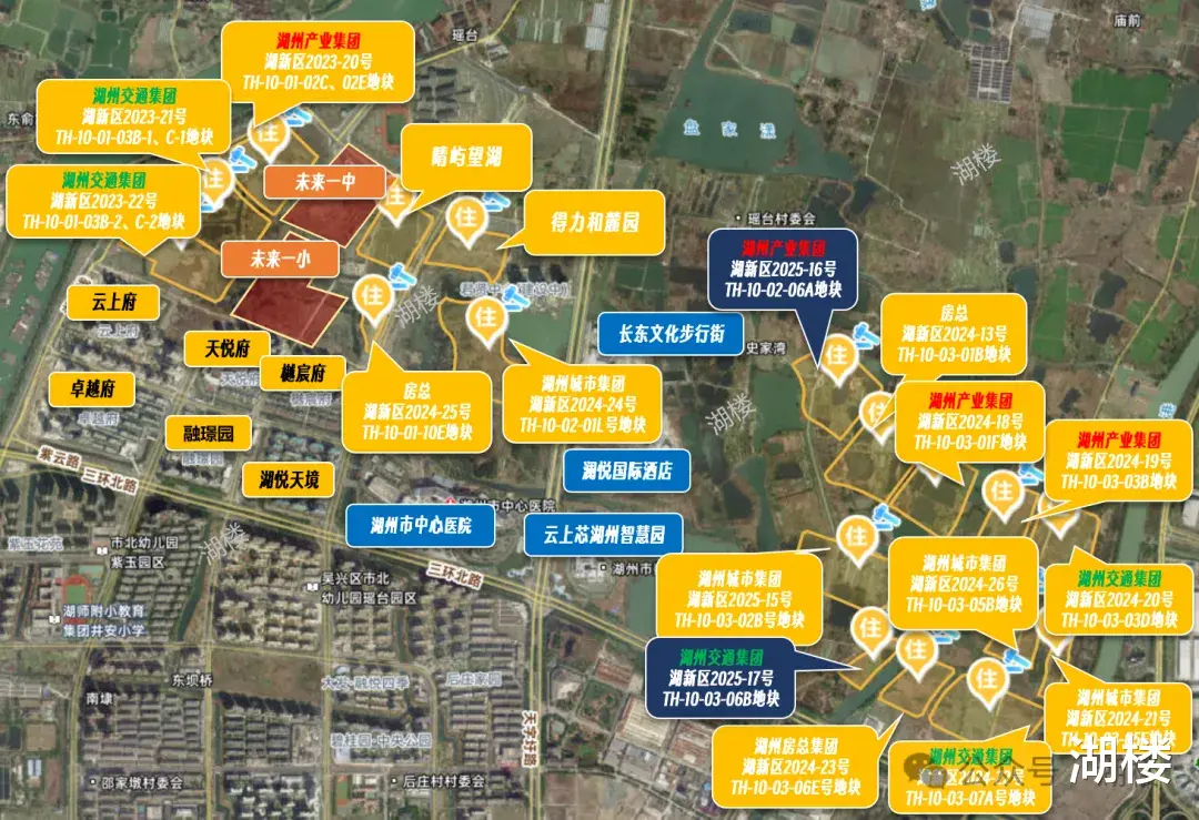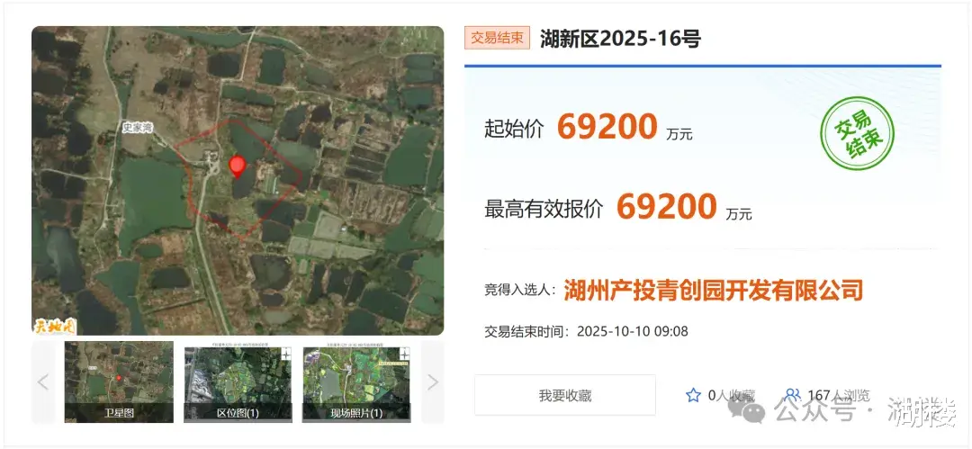 ●湖新区2025-16号,即草田漾单元TH-10-02-06A号地块,占地62091㎡,容积率1.0-1.4,由湖州产投青创园开发有限公司(湖州产业集团)以底价6.92亿摘得,成交楼面价7961元/㎡。