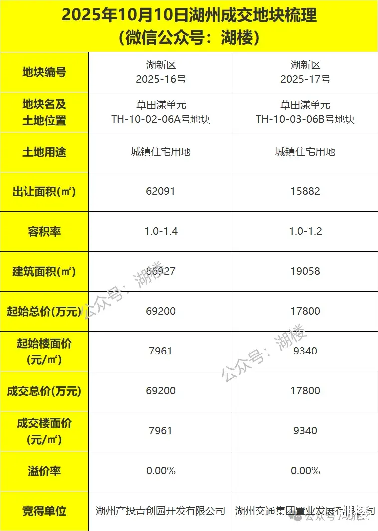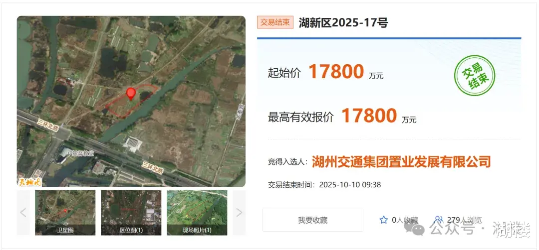 ● 湖新区2025-17号,即草田漾单元TH-10-03-06B号地块,占地15882㎡,容积率1.0-1.2,由湖州交通集团置业发展有限公司以底价1.78亿摘得,成交楼面价9340元/㎡。