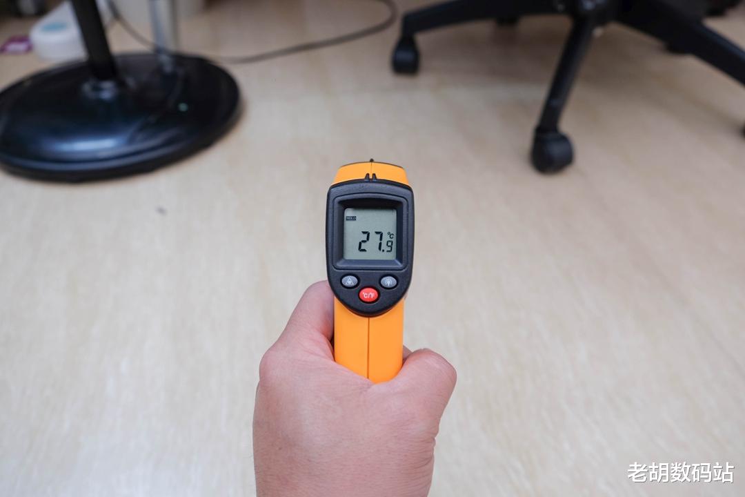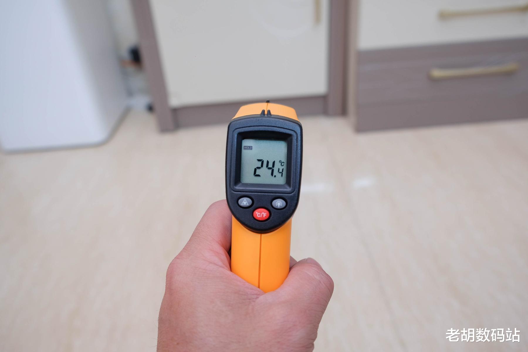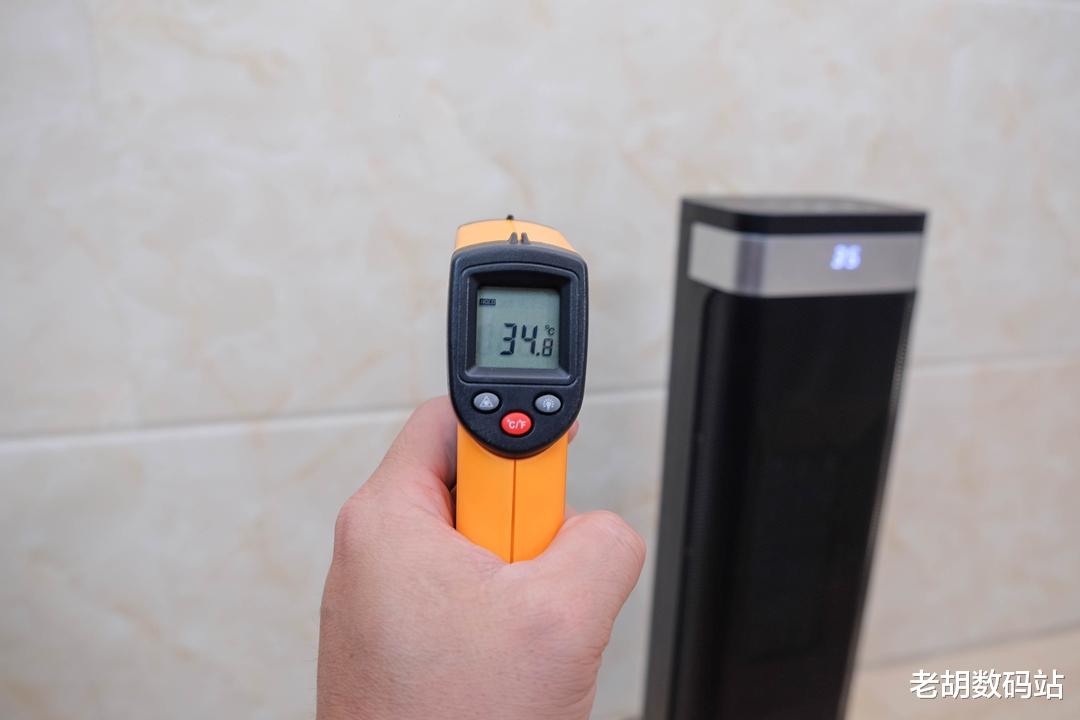 接着对房间温度的均匀性进行了测试:在暖风机开启15分钟后,使用红外测温仪分别测量屋内不同角落的温度。结果显示各区域温差极小,稍微远的仅在5度左右波动,整体加热分布非常均匀。这得益于其搭载的超大尺寸加厚石墨烯速热模组、风动引擎系统、母婴级柔风导热技术,并结合超广角立体矩阵式导热设计、涡轮增压气流倍增与涡喷聚风筒结构,配合特制双通道高速金属直流电机,共同构建出一套高效的热循环系统。