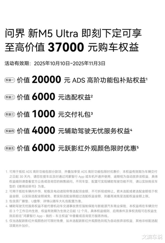 除了出色的产品力,问界新M5 Ultra还提供至高价值37000元的购车礼遇,20000元ADS高阶功能包补贴、6000元选配权益、1000元交付礼包、4000元辅助驾驶无忧服务权益。跃影红新车色还推出6000元限时优惠,丰富的购车权益直击用户核心需求。