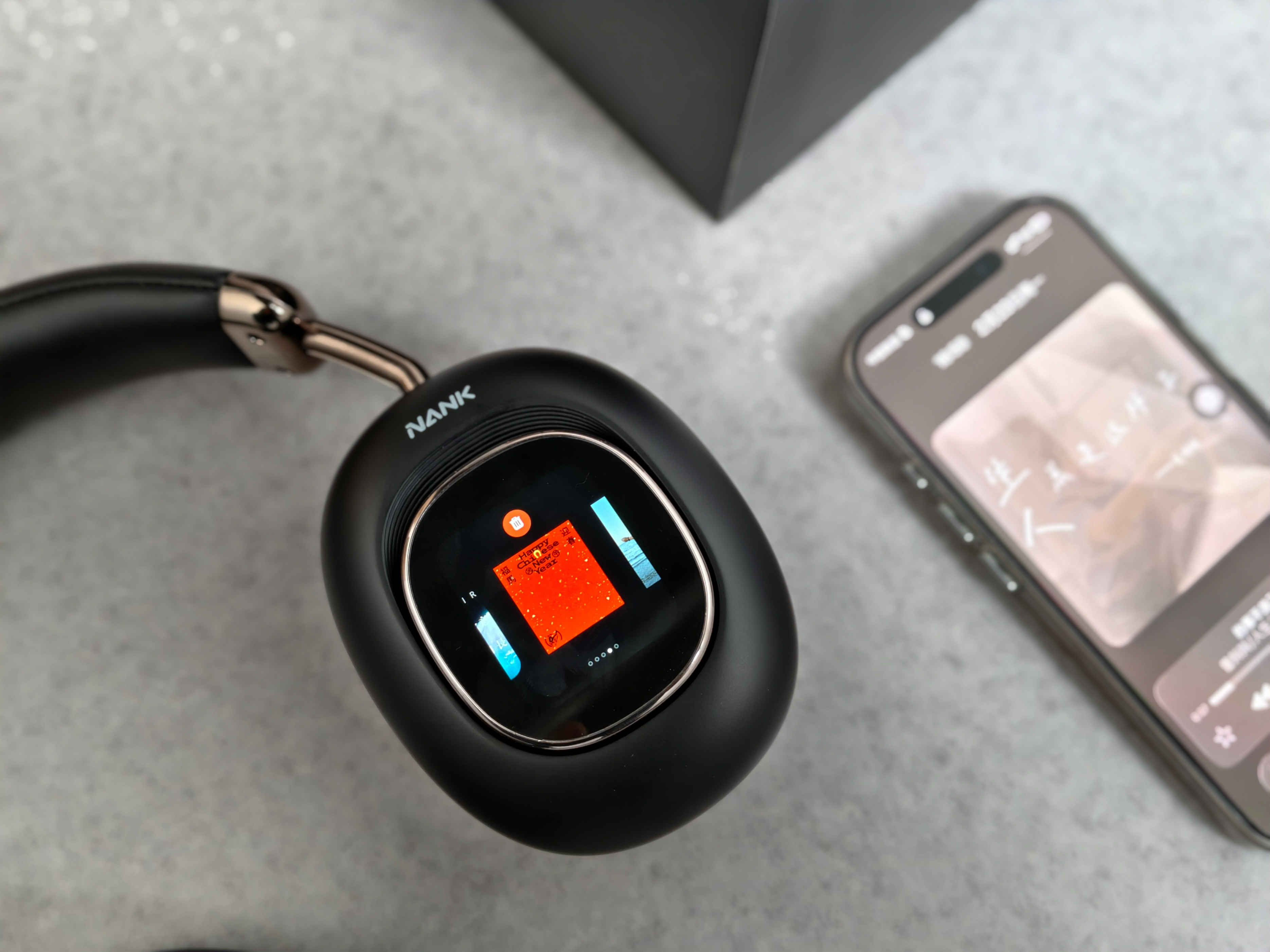 我选的是“曜石黑”配色,黑色是经典,还有一款是云絮黄,我比较喜欢经典的颜色。但重头戏在两侧——两块磁吸式灵动屏,轻轻一扣就能取下来,特别解压。通过APP可以自定义显示内容,动图、文字跑马灯、表情包都行。上周朋友聚会,我把左耳屏换成“别理我”,右耳屏换成“发呆中”,瞬间成为全场焦点。这大概是我用过最“社牛”的耳机了。