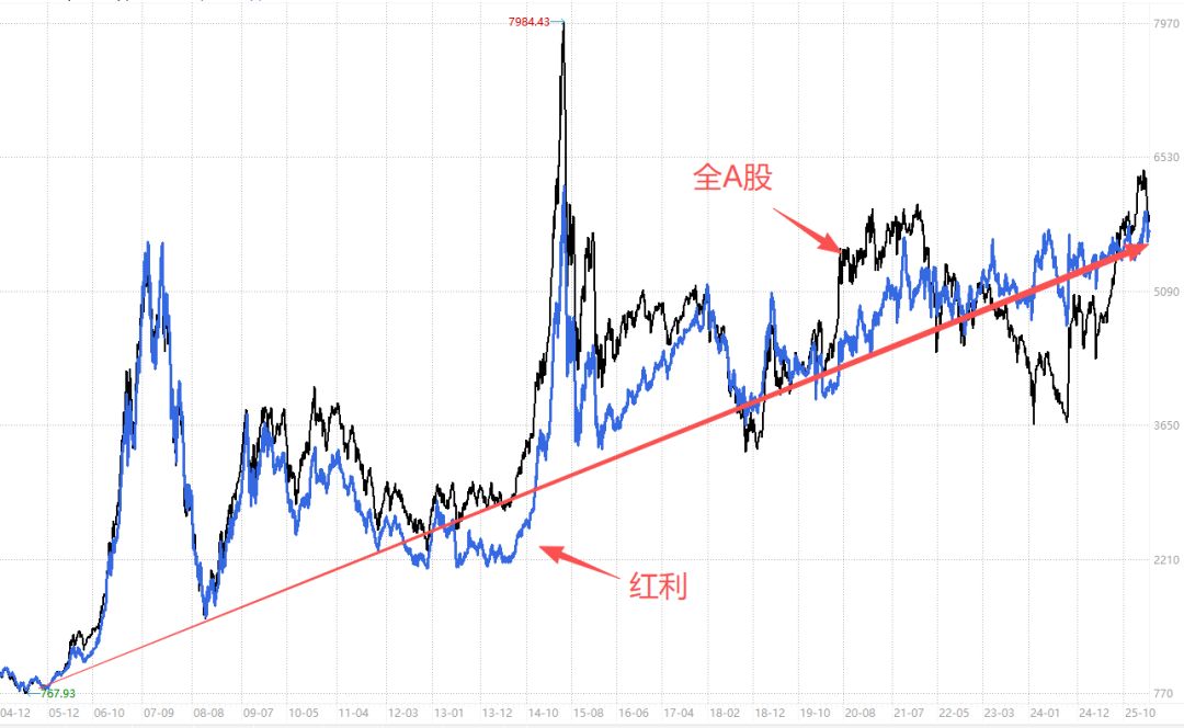 过去20年全A股和红利股走势如下图。无论谁强谁弱,最后都是长期上涨的。算上股息后,年化收益率约为8%,其实要超过大部分股民的收益。