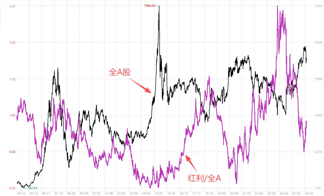 下图黑线是过去20年A股整体走势。紫线是红利股相对于A股比值(即「红A比」)。紫线向上表示红利股走强,向下表示A股走强。