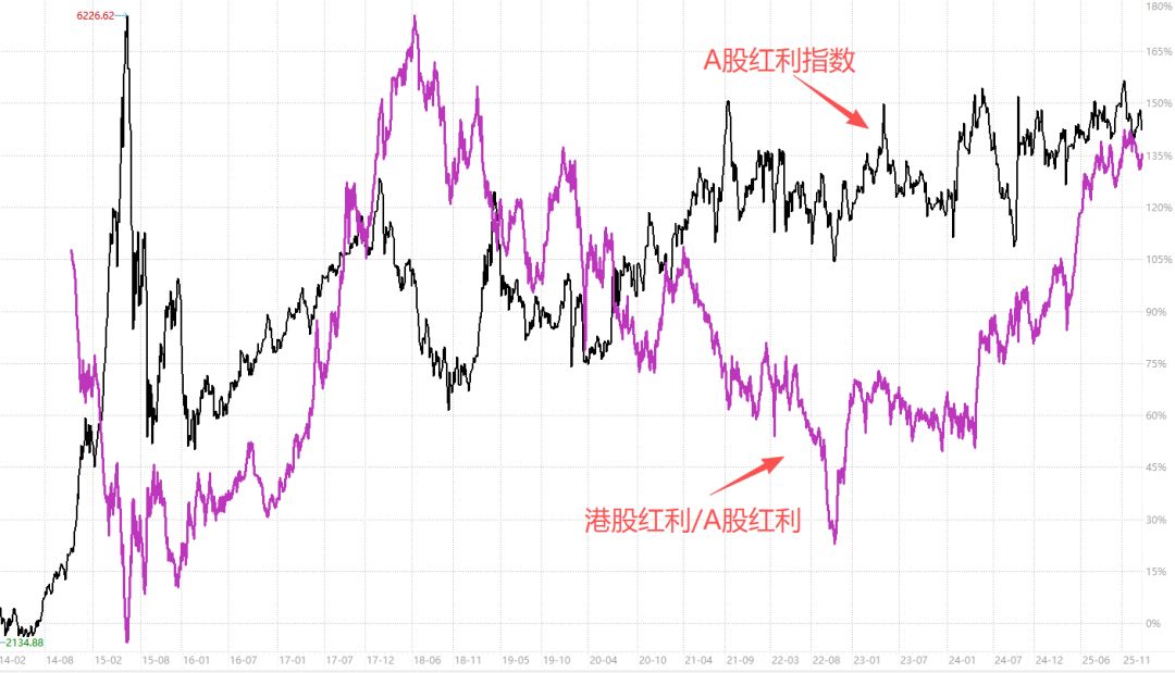 我们再简单看一个比值。下图黑线是A股红利指数走势,紫线是港股红利相对A股红利的比值。