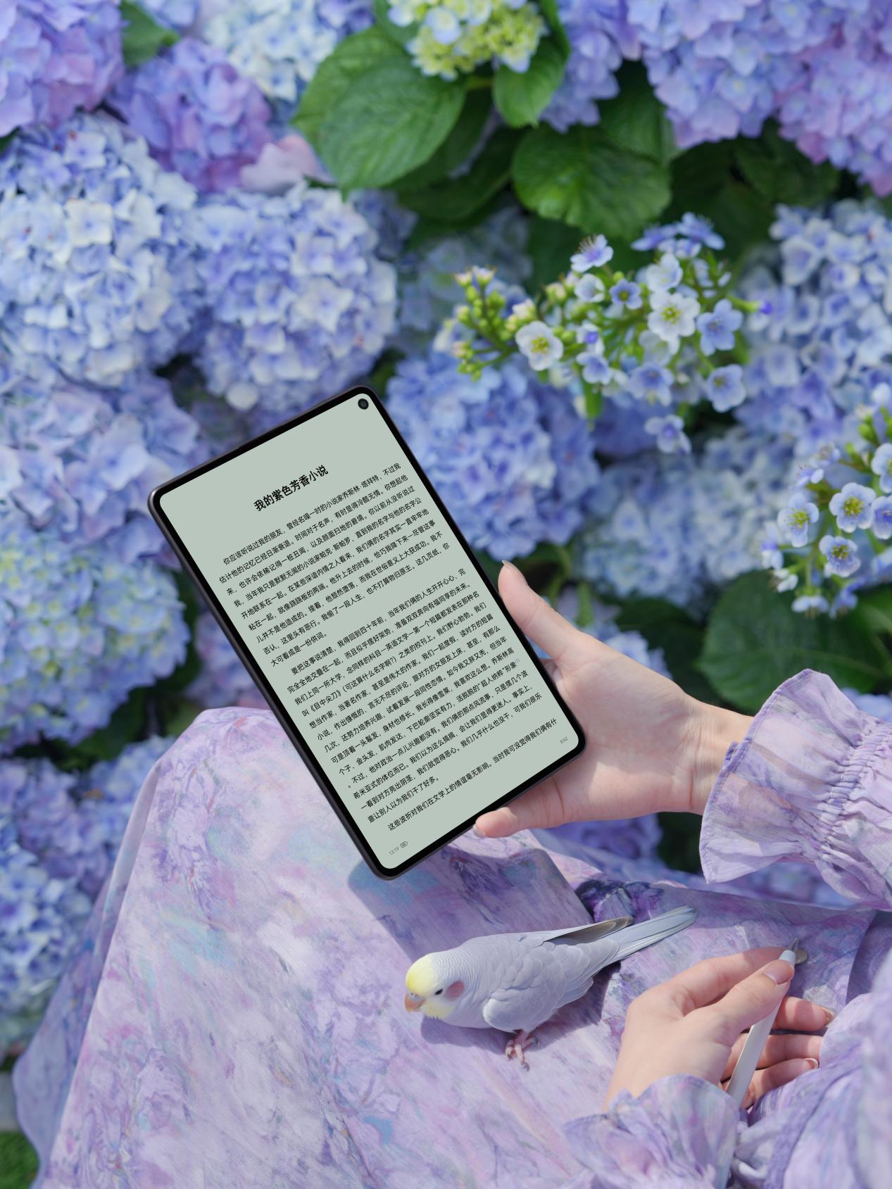 而另一款华为MatePad Mini 悦读版幻影紫,则走的是“随行轻薄”路线。它薄至5.1mm,重量仅255g,单手握持毫无压力。幻影紫在这里结合了3D锦纤工艺,摸上去竟然有一种类似高级织物的温润感,告别了金属的冰冷,闪光纱肌理让光线在表面跳跃,灰调的紫色显得内敛又自信。而且它搭载的8.8英寸柔性OLED全面屏,拥有92%的超高屏占比,1800nits亮度让它成了名副其实的“口袋里的移动书房”。此外,华为MatePad Mini 悦读版还支持灵犀通信,可插卡使用,随时随地接打电话和上网。