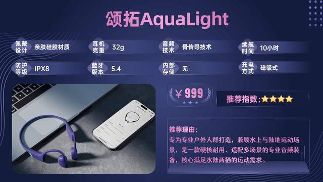 该机核心优势为专业防护、运动监测与优质听感,完美适配中高强度运动。适合有运动数据记录需求、追求专业性能的高端运动爱好者,是中高强度运动场景中的标杆级骨传导耳机。